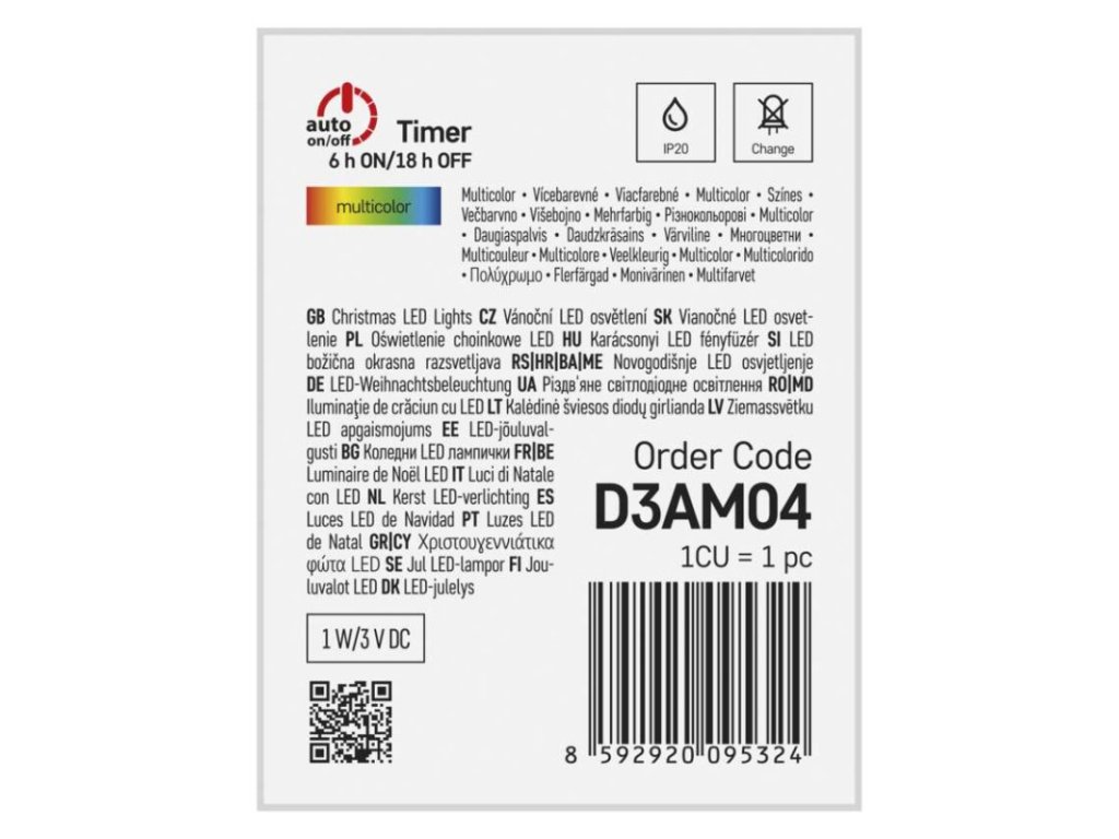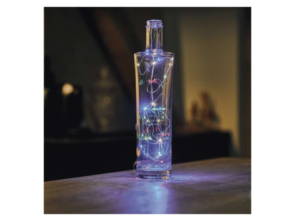 barva drátu: stříbrná|barva světla: multicolor|časovač: ano|dálkový ovladač: ne|délka přívodu: 0,5 m|funkce: svítí|krytí: IP20|LED mezera: 10 cm|materiál: kov|možnost propojení: ne|počet LED: 20|použití: vnitřní|příkon: 1 W|prodejní obal: 1 ks, krabice|produkt: nano řetěz|pro výšku stromu: neuvádí se|rozměr: 1,9 m|tvar: nano|typ napájení: baterie 2× AA (není součástí balení)|velikost LED: 3 mm (nano)|vstupní napětí: neuvádí se|výstupní napětí: 3 V DC|záruční doba: 2 roky|životnost: 10 000 hodin