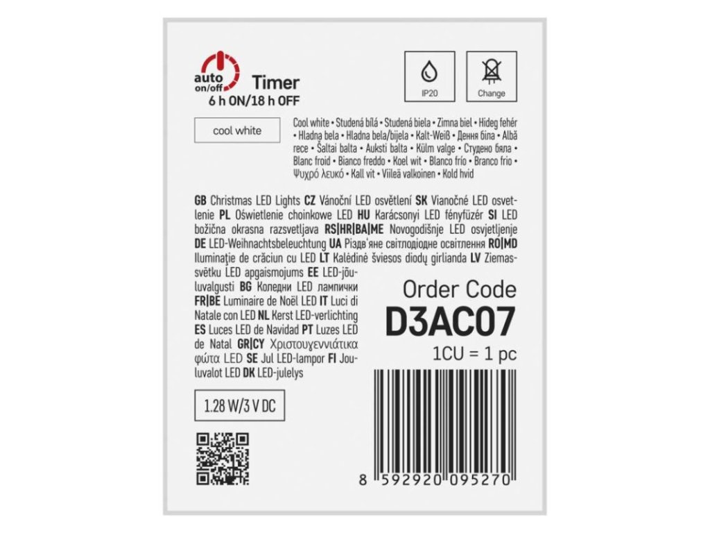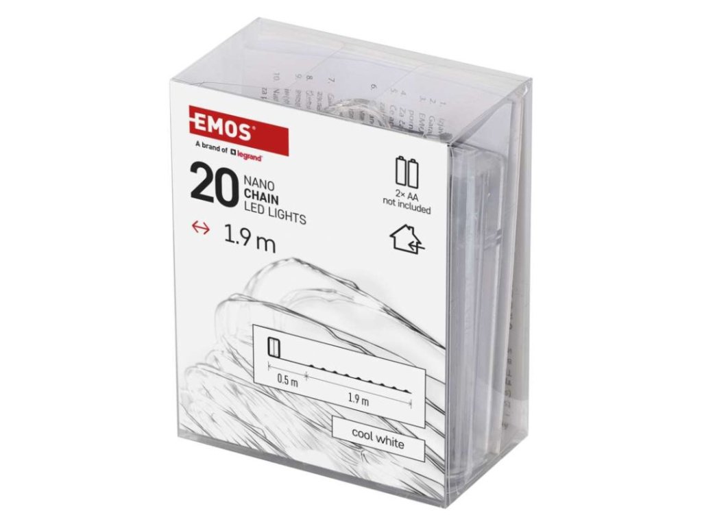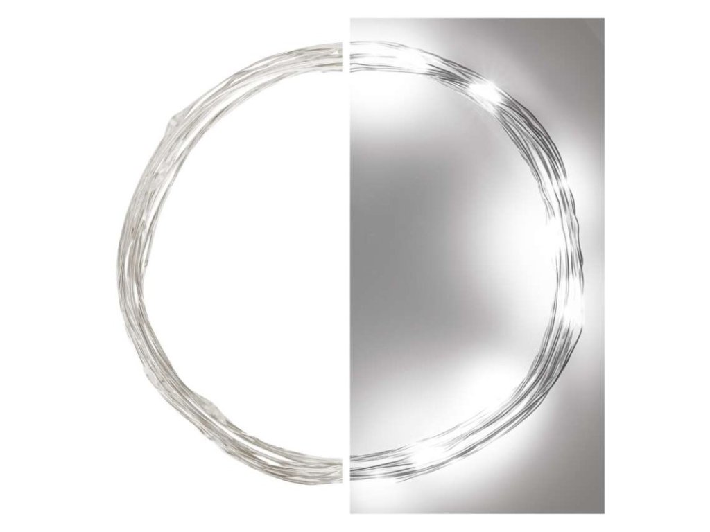 barva drátu: stříbrná|barva světla: studená bílá|časovač: ano|dálkový ovladač: ne|délka přívodu: 0,5 m|funkce: svítí|krytí: IP20|LED mezera: 10 cm|materiál: kov|možnost propojení: ne|počet LED: 20|použití: vnitřní|příkon: 1,28 W|prodejní obal: 1 ks, krabice|produkt: nano řetěz|pro výšku stromu: neuvádí se|rozměr: 1,9 m|tvar: nano|typ napájení: baterie 2× AA (není součástí balení)|velikost LED: 3 mm (nano)|vstupní napětí: neuvádí se|výstupní napětí: 3 V DC|záruční doba: 2 roky|životnost: 10 000 hodin