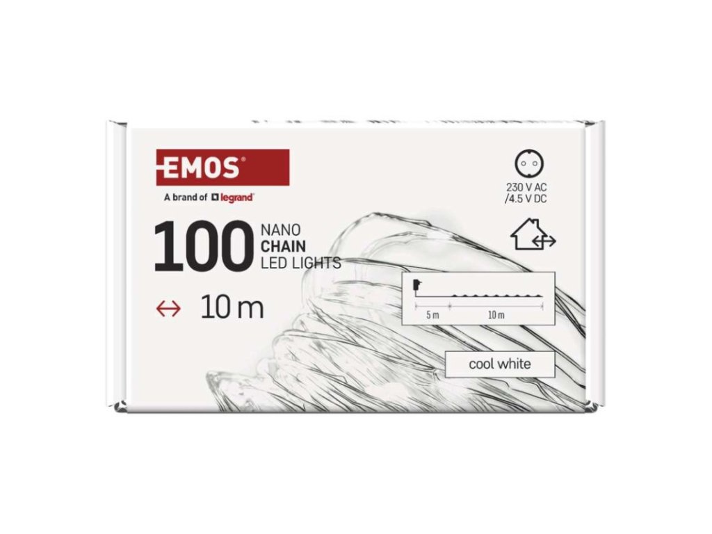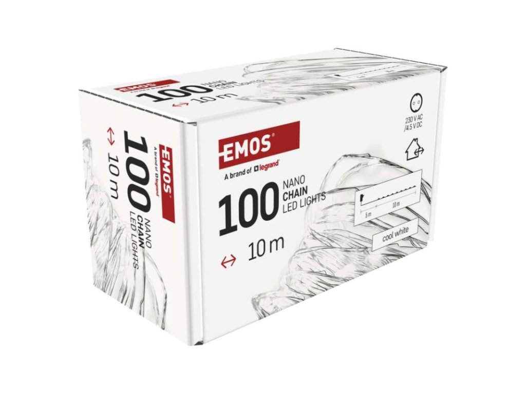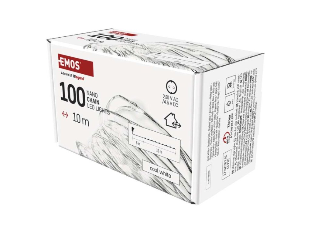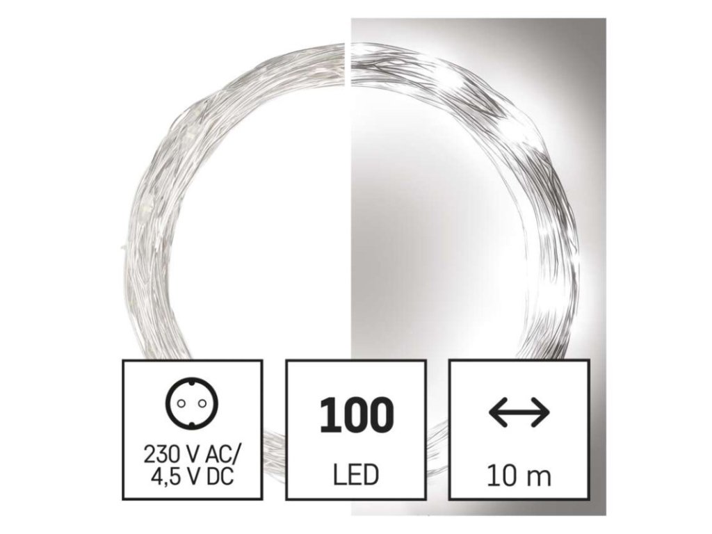 barva drátu: stříbrná|barva světla: studená bílá|časovač: ano|dálkový ovladač: ne|délka přívodu: 5 m|funkce: svítí|krytí: IP44|LED mezera: 10 cm|materiál: kov|možnost propojení: ne|počet LED: 100|použití: venkovní i vnitřní|příkon: 2,7 W|prodejní obal: 1 ks, krabice|produkt: nano řetěz|pro výšku stromu: 160 cm|rozměr: 10 m|tvar: nano|typ napájení: síťový adaptér|velikost LED: 3 mm (nano)|vstupní napětí: 230 V AC|výstupní napětí: 4,5 V DC|záruční doba: 2 roky|životnost: 10 000 hodin