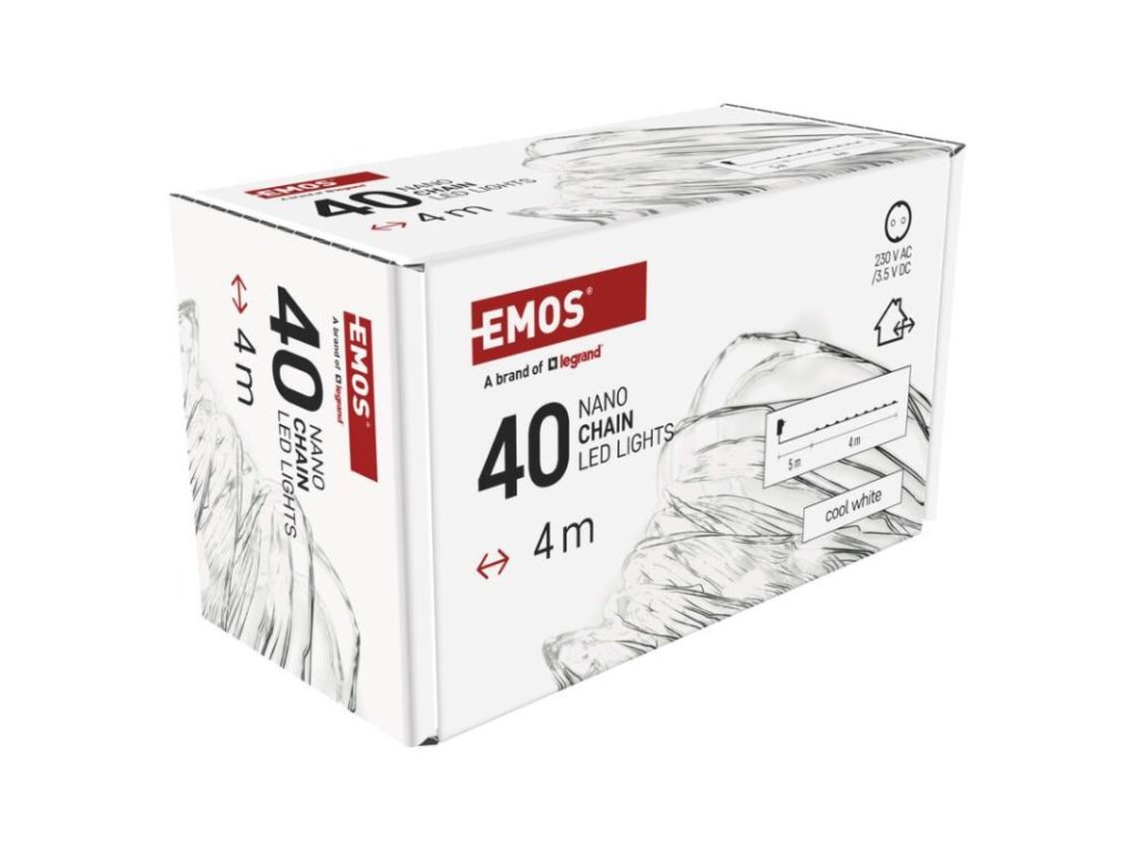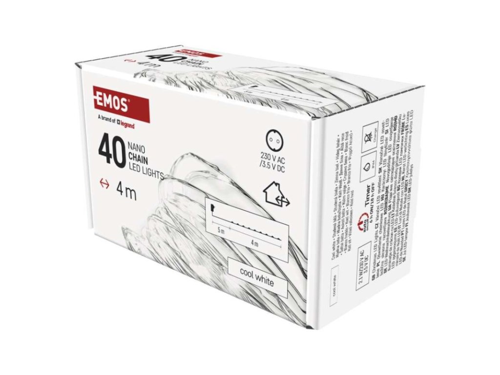 barva drátu: stříbrná|barva světla: studená bílá|časovač: ano|dálkový ovladač: ne|délka přívodu: 5 m|funkce: svítí|krytí: IP44|LED mezera: 10 cm|materiál: kov|možnost propojení: ne|počet LED: 40|použití: venkovní i vnitřní|příkon: 2,1 W|prodejní obal: 1 ks, krabice|produkt: nano řetěz|pro výšku stromu: 100 cm|rozměr: 4 m|tvar: nano|typ napájení: síťový adaptér|velikost LED: 3 mm (nano)|vstupní napětí: 230 V AC|výstupní napětí: 3,5 V DC|záruční doba: 2 roky|životnost: 10 000 hodin