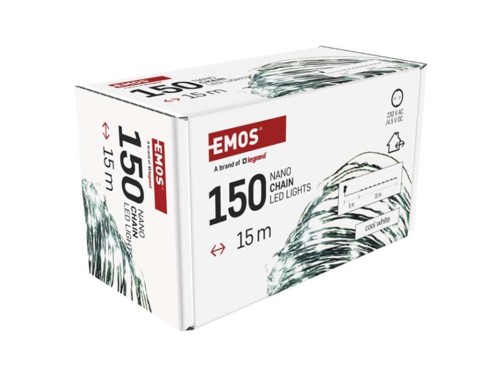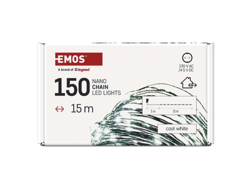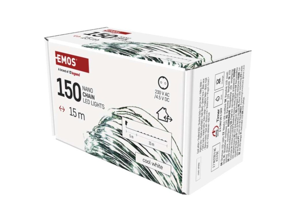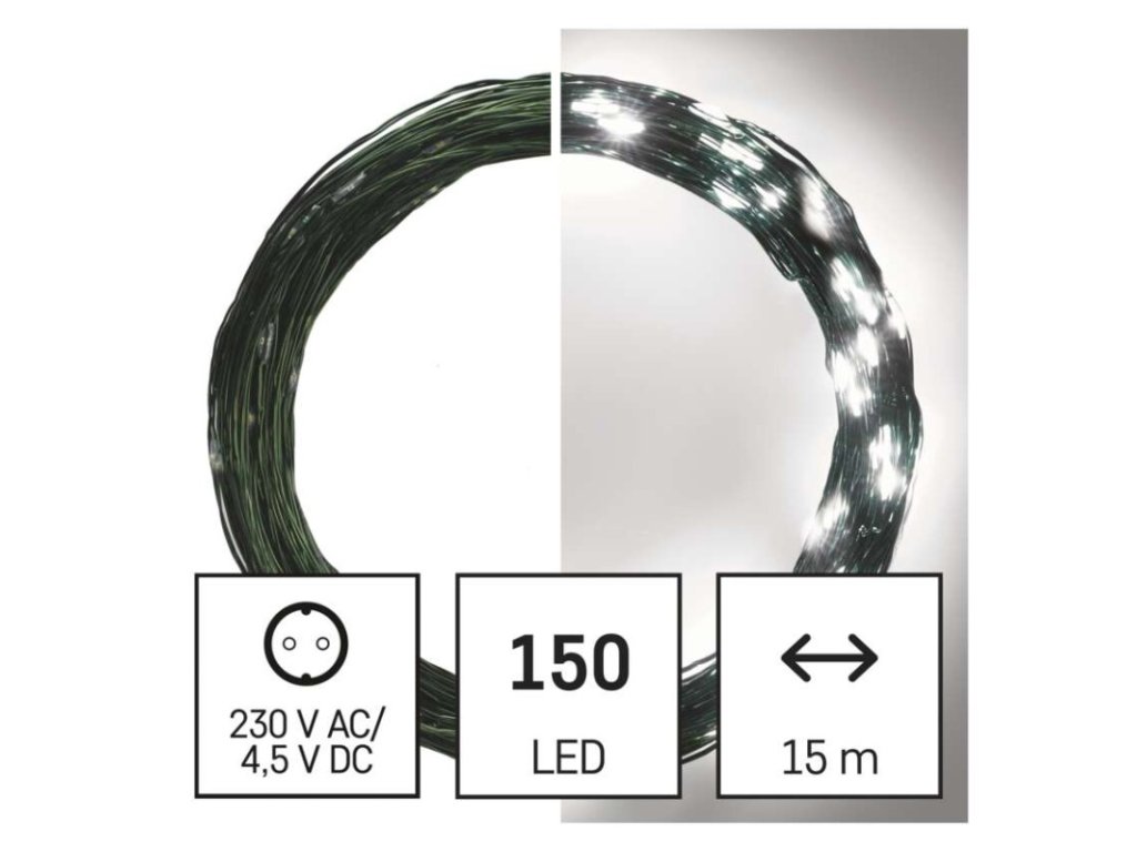barva drátu: zelená|barva světla: studená bílá|časovač: ano|dálkový ovladač: ne|délka přívodu: 5 m|funkce: svítí|krytí: IP44|LED mezera: 10 cm|materiál: kov|možnost propojení: ne|počet LED: 150|použití: venkovní i vnitřní|příkon: 2,7 W|prodejní obal: 1 ks, krabice|produkt: nano řetěz|pro výšku stromu: 170 cm|rozměr: 15 m|tvar: nano|typ napájení: síťový adaptér|velikost LED: 3 mm (nano)|vstupní napětí: 230 V AC|výstupní napětí: 4,5 V DC|záruční doba: 2 roky|životnost: 10 000 hodin