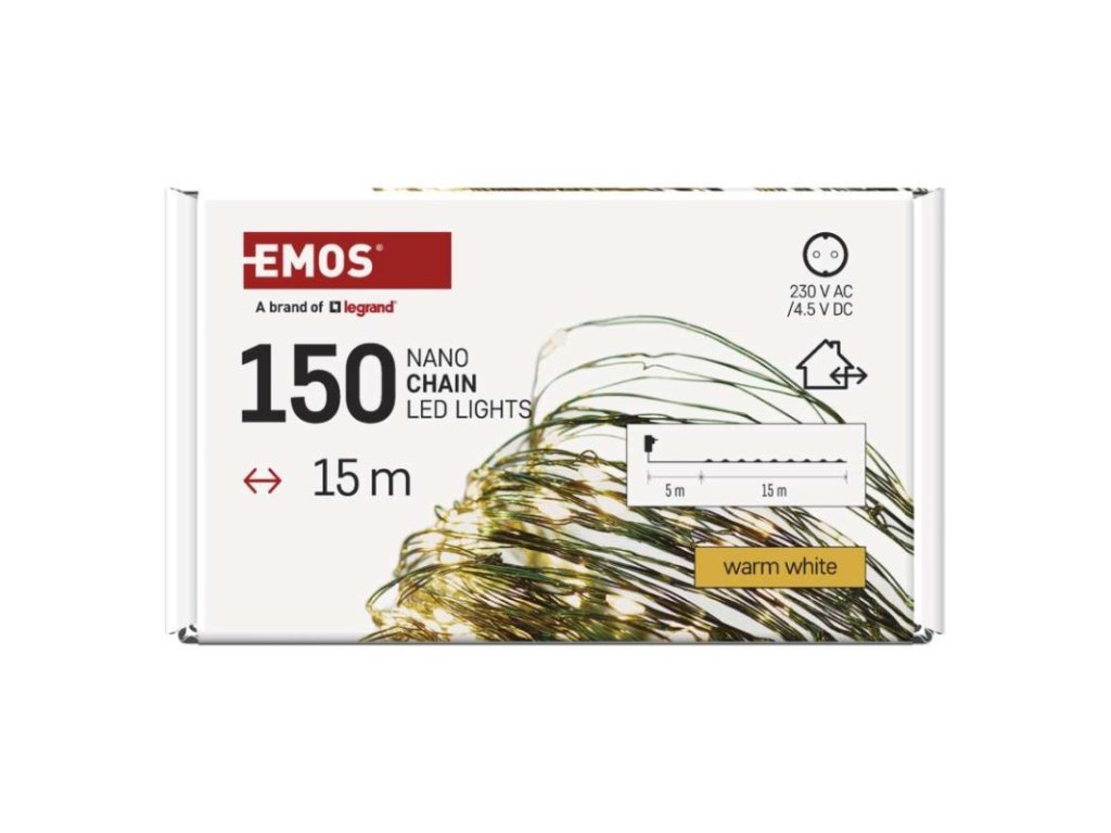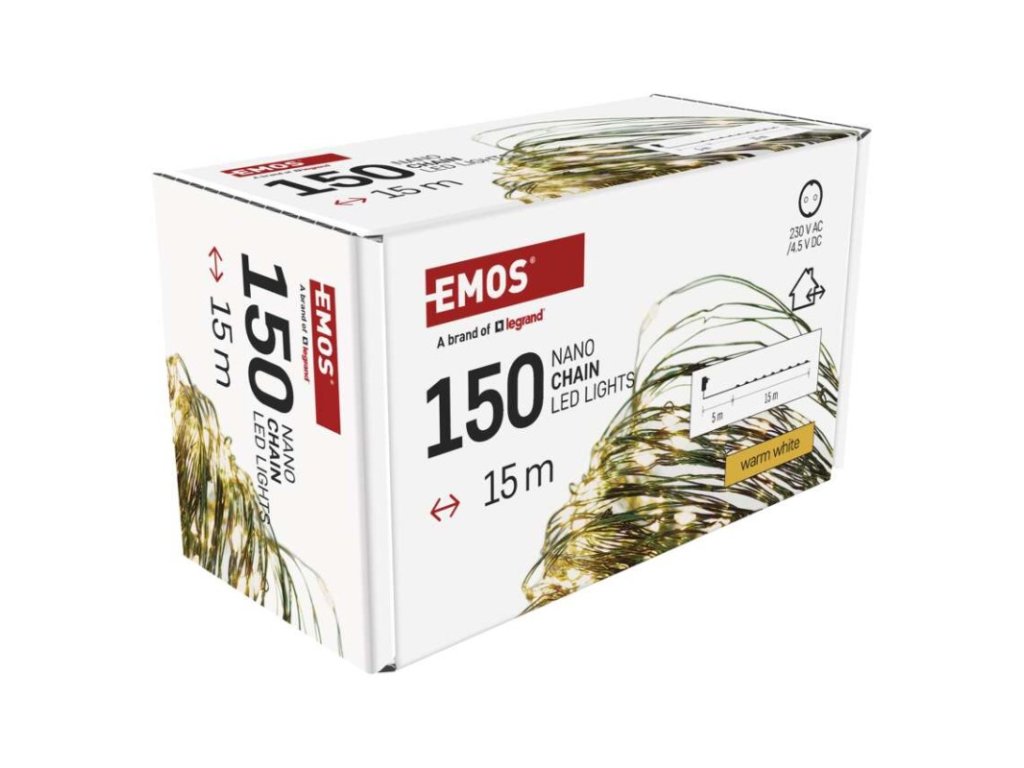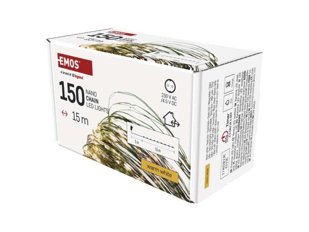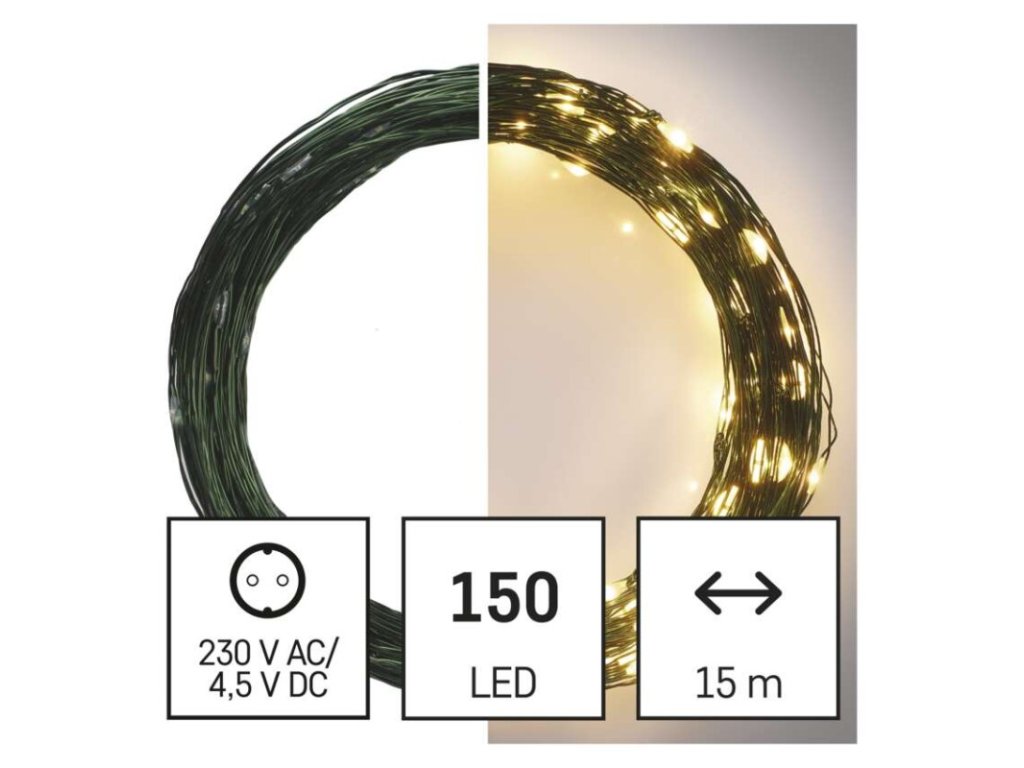 barva drátu: zelená|barva světla: teplá bílá|časovač: ano|dálkový ovladač: ne|délka přívodu: 5 m|funkce: svítí|krytí: IP44|LED mezera: 10 cm|materiál: kov|možnost propojení: ne|počet LED: 150|použití: venkovní i vnitřní|příkon: 2,7 W|prodejní obal: 1 ks, krabice|produkt: nano řetěz|pro výšku stromu: 170 cm|rozměr: 15 m|tvar: nano|typ napájení: síťový adaptér|velikost LED: 3 mm (nano)|vstupní napětí: 230 V AC|výstupní napětí: 4,5 V DC|záruční doba: 2 roky|životnost: 10 000 hodin