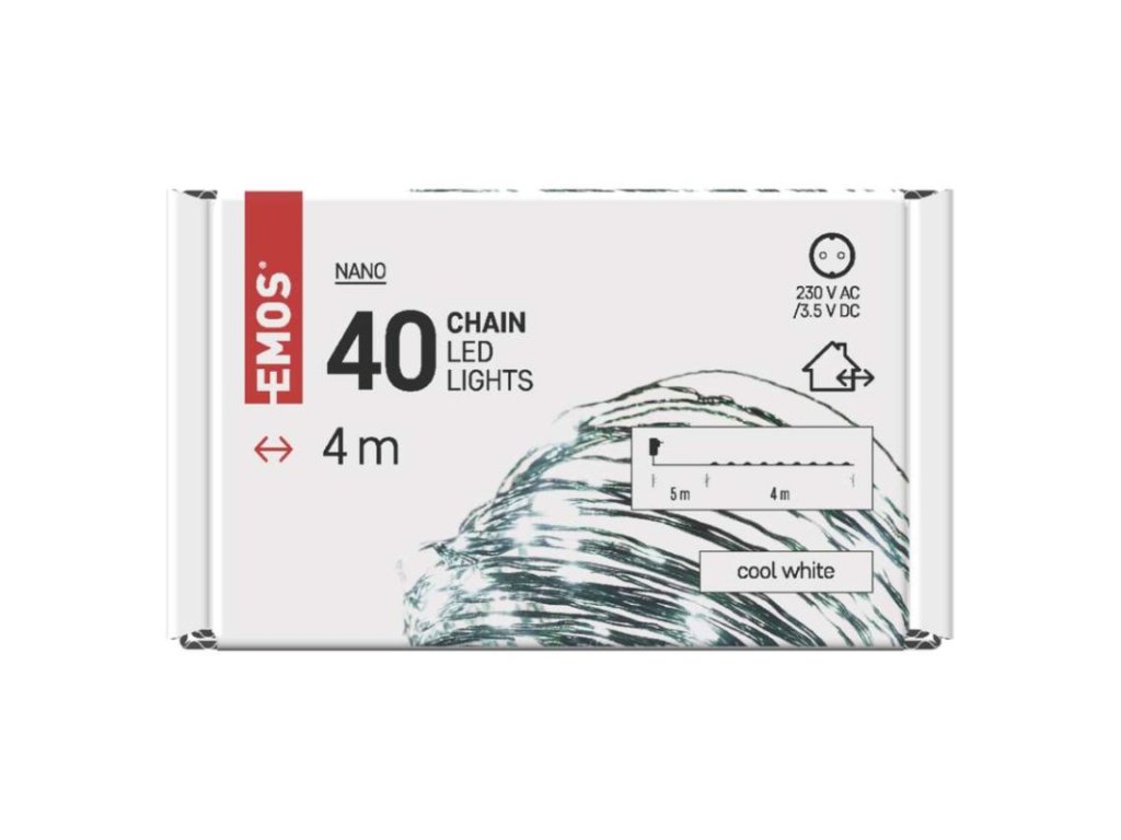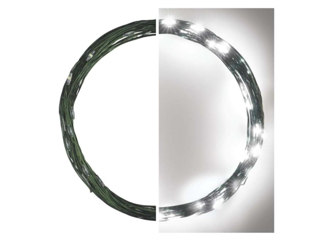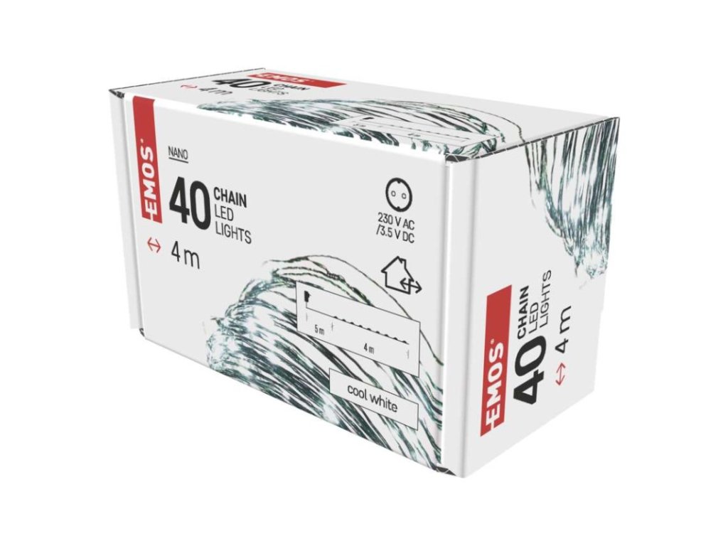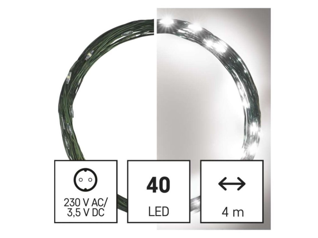 barva drátu: zelená|barva světla: studená bílá|časovač: ano|dálkový ovladač: ne|délka přívodu: 5 m|funkce: svítí|krytí: IP44|LED mezera: 10 cm|materiál: kov|možnost propojení: ne|počet LED: 40|použití: venkovní i vnitřní|příkon: 2,1 W|prodejní obal: 1 ks, krabice|produkt: nano řetěz|pro výšku stromu: 100 cm|rozměr: 4 m|tvar: nano|typ napájení: síťový adaptér|velikost LED: 3 mm (nano)|vstupní napětí: 230 V AC|výstupní napětí: 3,5 V DC|záruční doba: 2 roky|životnost: 10 000 hodin