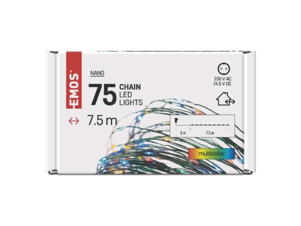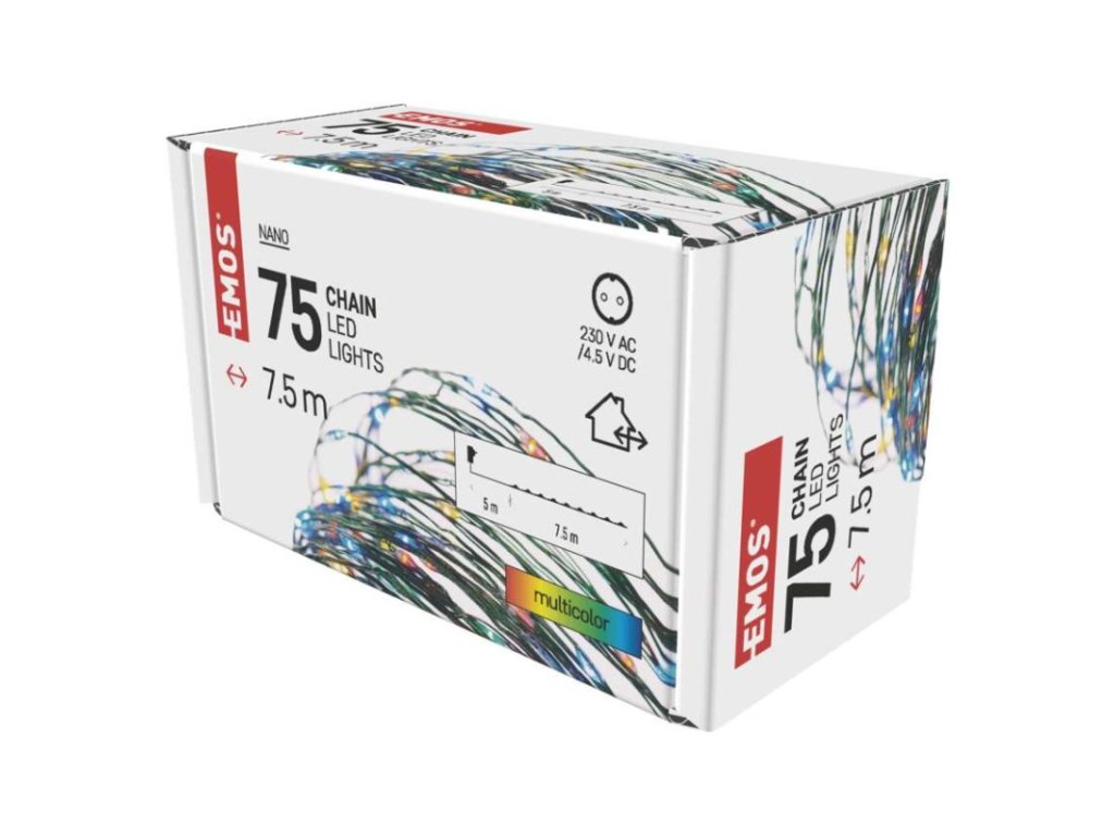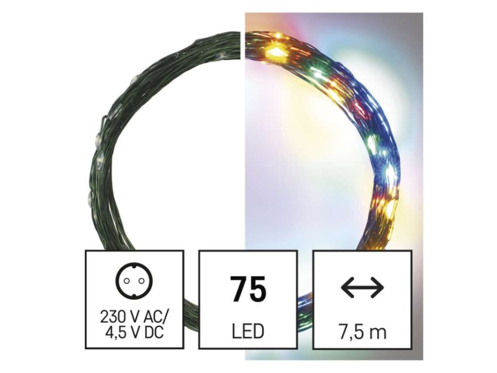 barva drátu: zelená|barva světla: multicolor|časovač: ano|dálkový ovladač: ne|délka přívodu: 5 m|funkce: svítí|krytí: IP44|LED mezera: 10 cm|materiál: kov|možnost propojení: ne|počet LED: 75|použití: venkovní i vnitřní|příkon: 2,7 W|prodejní obal: 1 ks, krabice|produkt: nano řetěz|pro výšku stromu: 140 cm|rozměr: 7,5 m|tvar: nano|typ napájení: síťový adaptér|velikost LED: 3 mm (nano)|vstupní napětí: 230 V AC|výstupní napětí: 4,5 V DC|záruční doba: 2 roky|životnost: 10 000 hodin