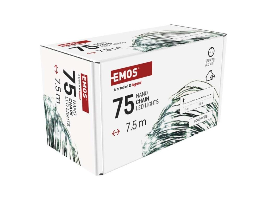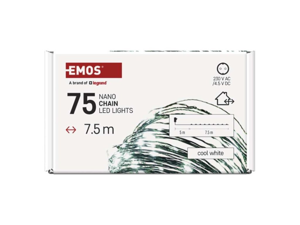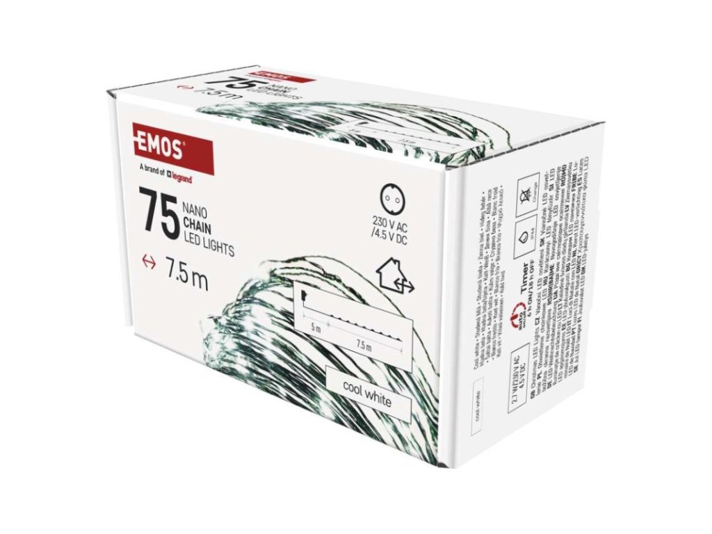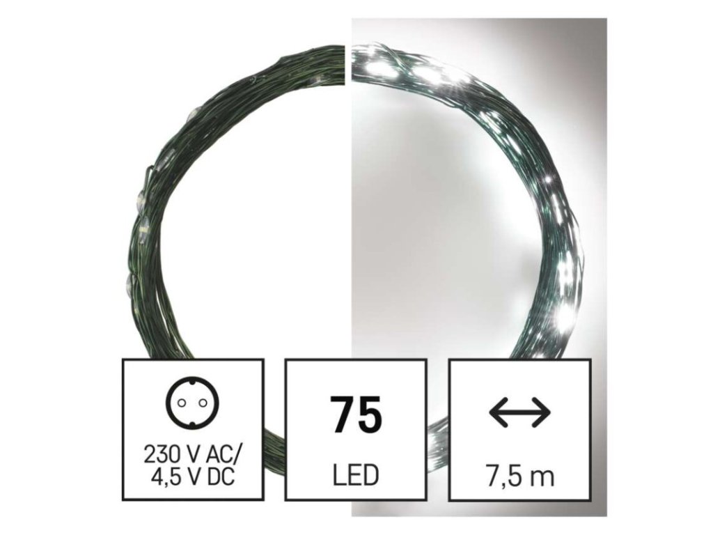 barva drátu: zelená|barva světla: studená bílá|časovač: ano|dálkový ovladač: ne|délka přívodu: 5 m|funkce: svítí|krytí: IP44|LED mezera: 10 cm|materiál: kov|možnost propojení: ne|počet LED: 75|použití: venkovní i vnitřní|příkon: 2,7 W|prodejní obal: 1 ks, krabice|produkt: nano řetěz|pro výšku stromu: 140 cm|rozměr: 7,5 m|tvar: nano|typ napájení: síťový adaptér|velikost LED: 3 mm (nano)|vstupní napětí: 230 V AC|výstupní napětí: 4,5 V DC|záruční doba: 2 roky|životnost: 10 000 hodin