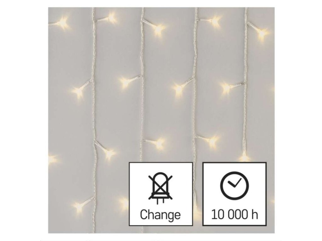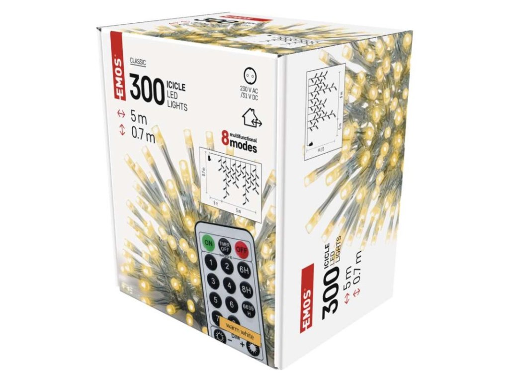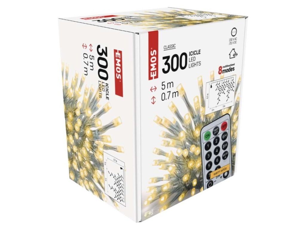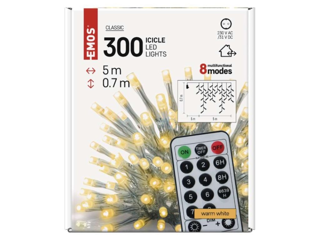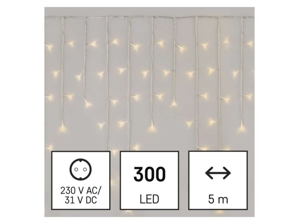 barva drátu: transparentní|barva světla: teplá bílá|časovač: ano|dálkový ovladač: ano (1× CR2032, součástí balení)|délka přívodu: 5 m|funkce: 8 módů (multifunkce)|krytí: IP44|LED mezera: 10 cm|materiál: PVC|možnost propojení: ne|počet LED: 300|použití: venkovní i vnitřní|příkon: 6 W|prodejní obal: 1 ks, krabice|produkt: krápníky|pro výšku stromu: neuvádí se|rozměr: 5 × 0,7 m|tvar: klasický|typ napájení: síťový adaptér|velikost LED: 5 mm|vstupní napětí: 230 V AC|výstupní napětí: 31 V DC|záruční doba: 2 roky|životnost: 10 000 hodin