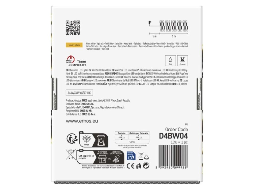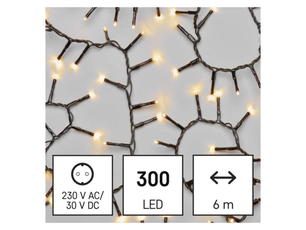 barva drátu: černá|barva světla: teplá bílá|časovač: ano|dálkový ovladač: ne|délka přívodu: 5 m|funkce: svítí|krytí: IP44|LED mezera: 2 cm|materiál: PVC|možnost propojení: ne|počet LED: 300|použití: venkovní i vnitřní|příkon: 3,6 W|prodejní obal: 1 ks, krabice|produkt: ježek|pro výšku stromu: neuvádí se|rozměr: 6 m|tvar: klasický|typ napájení: síťový adaptér|velikost LED: 3 mm|vstupní napětí: 230 V AC|výstupní napětí: 30 V DC|záruční doba: 2 roky|životnost: 10 000 hodin
