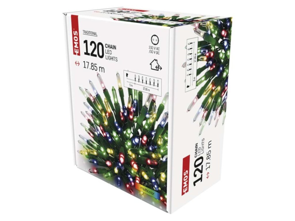barva drátu: zelená|barva světla: multicolor|časovač: ne|dálkový ovladač: ne|délka přívodu: 5 m|funkce: svítí|krytí: IP44|LED mezera: neuvádí se|materiál: plast|možnost propojení: ne|počet LED: 120|použití: venkovní i vnitřní|příkon: 3,6 W|prodejní obal: 1 ks, krabice|produkt: řetěz|pro výšku stromu: neuvádí se|rozměr: 17,85 m|tvar: tradiční|typ napájení: síťový adaptér|velikost LED: neuvádí se|vstupní napětí: 230 V AC|výstupní napětí: 30 V DC|záruční doba: 2 roky|životnost: 10 000 hodin