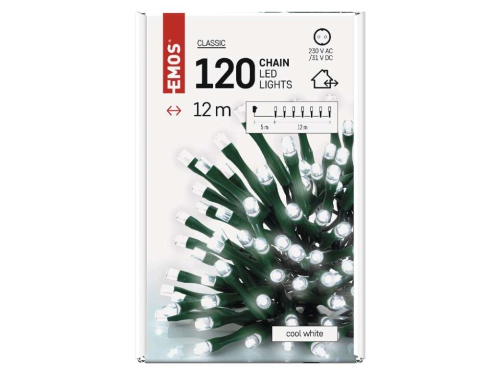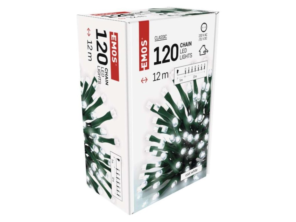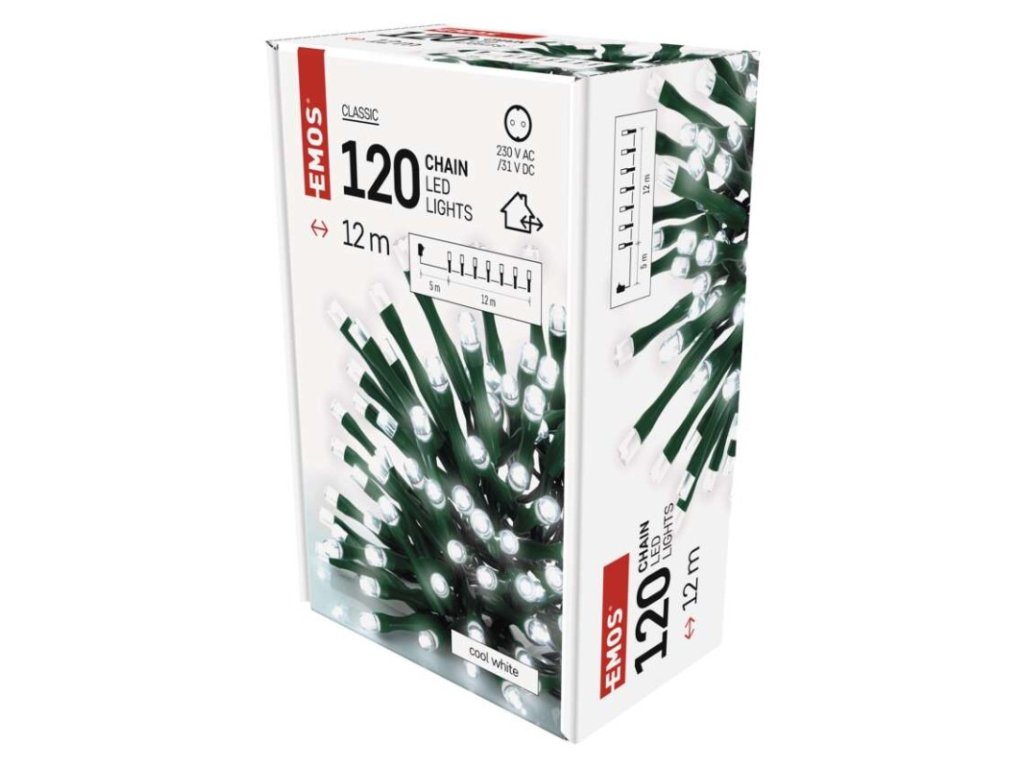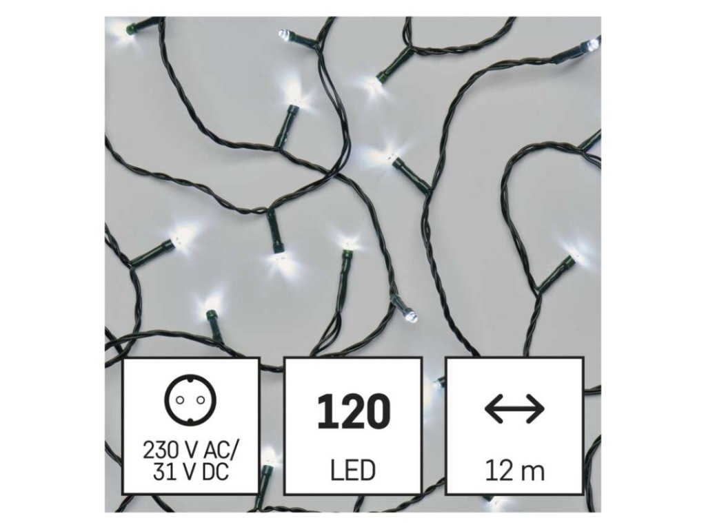 barva drátu: zelená|barva světla: studená bílá|časovač: ano|dálkový ovladač: ne|délka přívodu: 5 m|funkce: svítí|krytí: IP44|LED mezera: 10 cm|materiál: PVC|možnost propojení: ne|počet LED: 120|použití: venkovní i vnitřní|příkon: 3,6 W|prodejní obal: 1 ks, krabice|produkt: řetěz|pro výšku stromu: 170 cm|rozměr: 12 m|tvar: klasický|typ napájení: síťový adaptér|velikost LED: 5 mm|vstupní napětí: 230 V AC|výstupní napětí: 31 V DC|záruční doba: 2 roky|životnost: 10 000 hodin