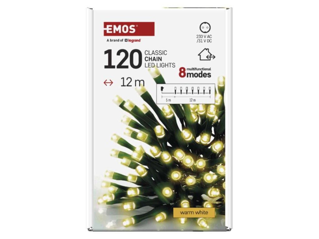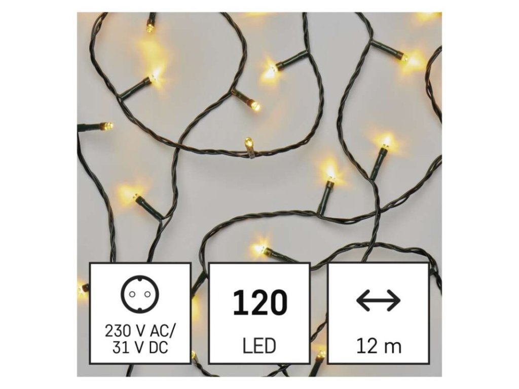 barva drátu: zelená|barva světla: teplá bílá|časovač: ano|dálkový ovladač: ne|další funkce: –|délka přívodu: 5 m|funkce: 8 módů (multifunkce)|jazyky aplikace: –|kompatibilita: –|krytí: IP44|LED mezera: 10 cm|materiál: PVC|možnost propojení: ne|notifikace do mobilní aplikace: ne|ovládání hlasovými asistenty: ne|počet LED: 120|podporované OS: –|použití: venkovní i vnitřní|přenosová frekvence: –|příkon: 3,6 W|prodejní obal: 1 ks, krabice|produkt: řetěz|protokol: –|pro výšku stromu: 170 cm|rozměr: 12 m|tvar: klasický|typ napájení: síťový adaptér|velikost LED: 5 mm|vstupní napětí: 230 V AC|výstupní napětí: 31 V DC|záruční doba: 2 roky|životnost: 10 000 hodin