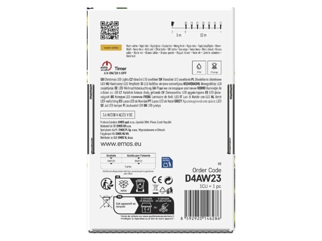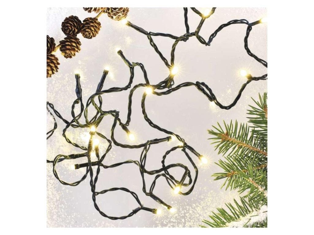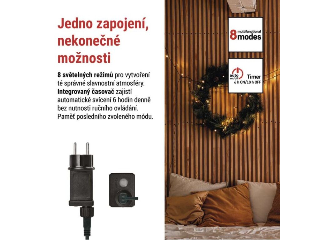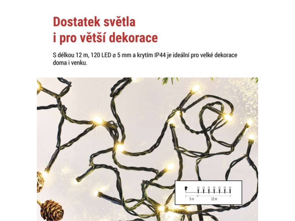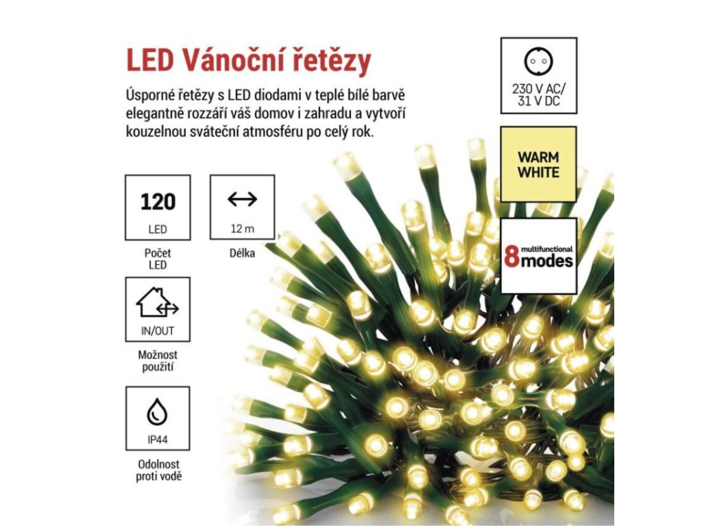 LED vánoční řetěz, 12 m, venkovní i vnitřní, teplá bílá, programy, časovač