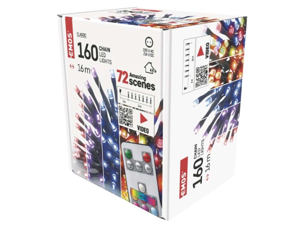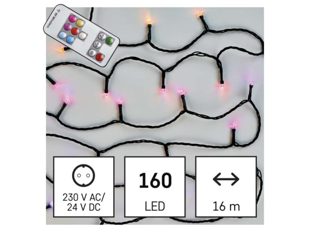 barva drátu: černá|barva světla: multicolor|časovač: ano|dálkový ovladač: ano (1× CR2032, součástí balení)|délka přívodu: 3 m|funkce: 72 módů|krytí: IP44|LED mezera: 10 cm|materiál: PVC|možnost propojení: ne|počet LED: 160|použití: venkovní i vnitřní|příkon: 24 W|prodejní obal: 1 ks, krabice|produkt: řetěz|pro výšku stromu: 180 cm|rozměr: 16 m|tvar: klasický|typ napájení: síťový adaptér|velikost LED: 5 mm|vstupní napětí: 230 V AC|výstupní napětí: 24 V DC|záruční doba: 2 roky|životnost: 10 000 hodin