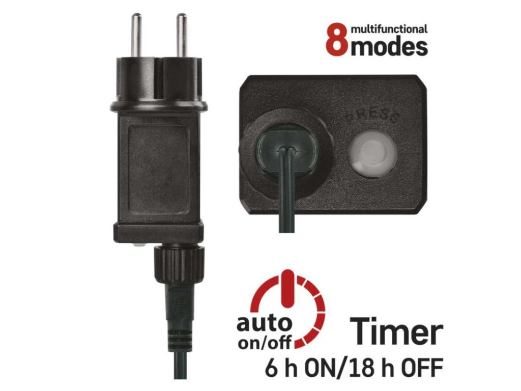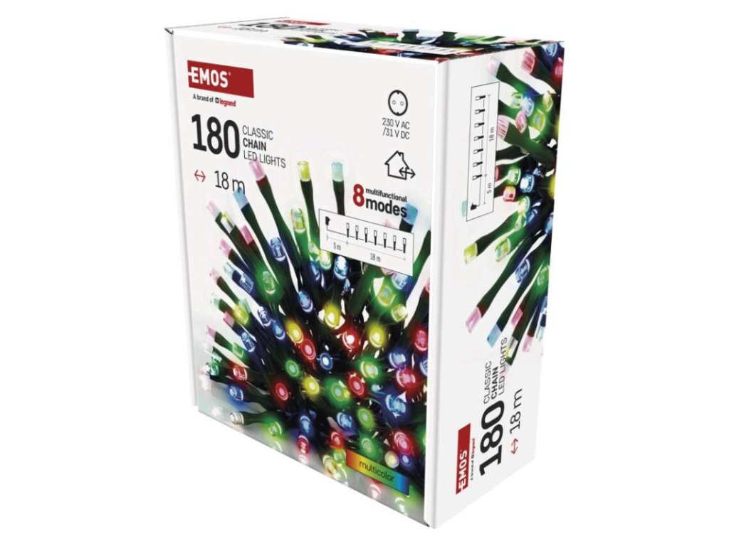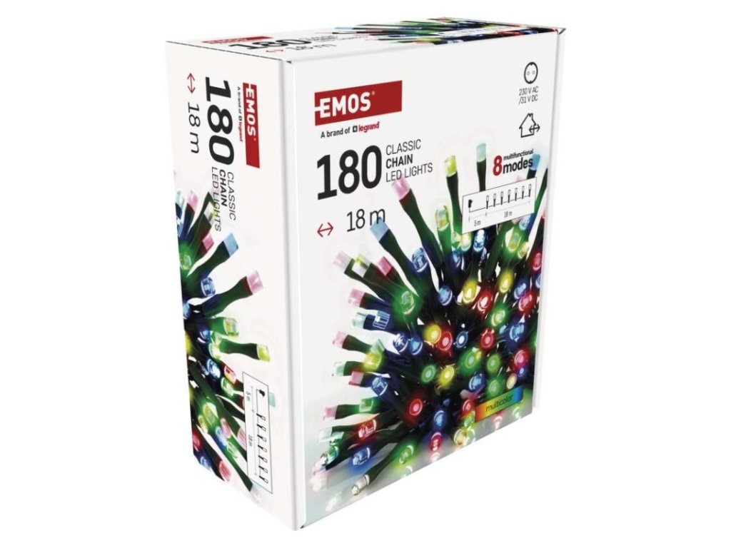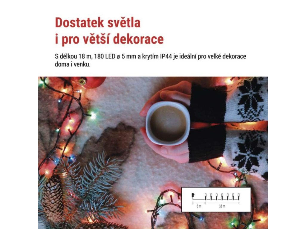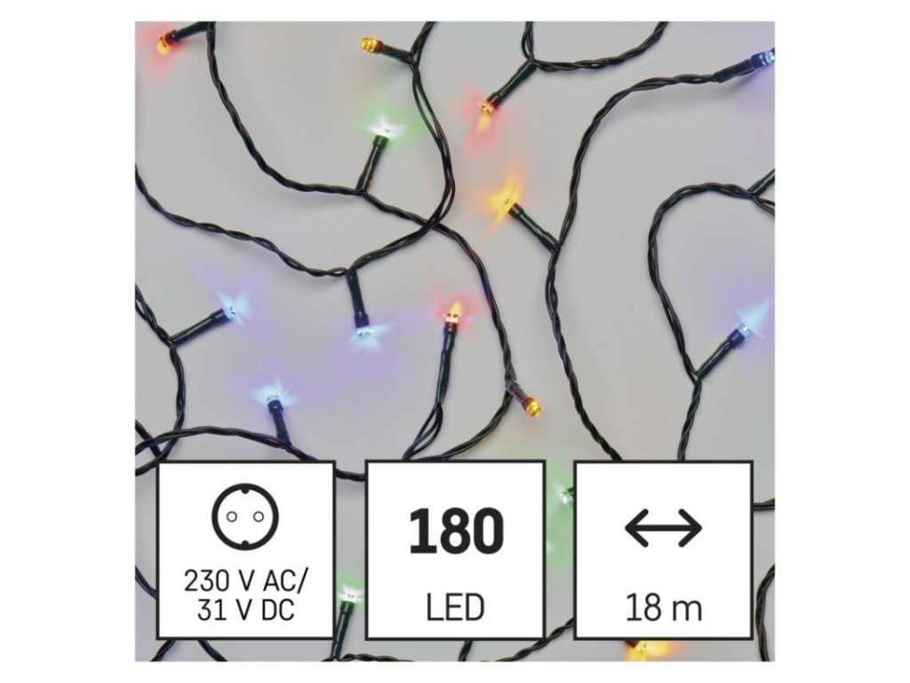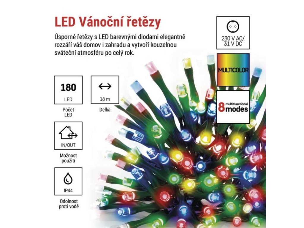 barva drátu: zelená|barva světla: multicolor|časovač: ano|dálkový ovladač: ne|další funkce: –|délka přívodu: 5 m|funkce: 8 módů (multifunkce)|jazyky aplikace: –|kompatibilita: –|krytí: IP44|LED mezera: 10 cm|materiál: PVC|možnost propojení: ne|notifikace do mobilní aplikace: ne|ovládání hlasovými asistenty: ne|počet LED: 180|podporované OS: –|použití: venkovní i vnitřní|přenosová frekvence: –|příkon: 3,6 W|prodejní obal: 1 ks, krabice|produkt: řetěz|protokol: –|pro výšku stromu: 200 cm|rozměr: 18 m|tvar: klasický|typ napájení: síťový adaptér|velikost LED: 5 mm|vstupní napětí: 230 V AC|výstupní napětí: 31 V DC|záruční doba: 2 roky|životnost: 10 000 hodin