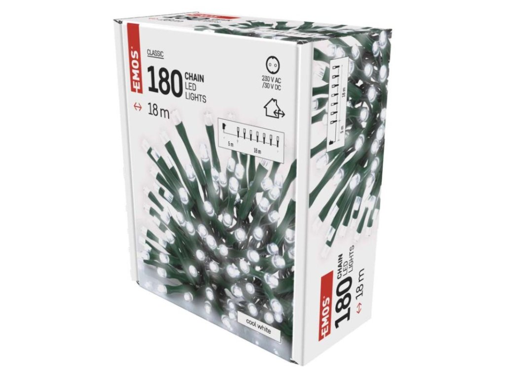 barva drátu: zelená|barva světla: studená bílá|časovač: ano|dálkový ovladač: ne|délka přívodu: 5 m|funkce: svítí|krytí: IP44|LED mezera: 10 cm|materiál: PVC|možnost propojení: ne|počet LED: 180|použití: venkovní i vnitřní|příkon: 3,6 W|prodejní obal: 1 ks, krabice|produkt: řetěz|pro výšku stromu: 200 cm|rozměr: 18 m|tvar: klasický|typ napájení: síťový adaptér|velikost LED: 5 mm|vstupní napětí: 230 V AC|výstupní napětí: 31 V DC|záruční doba: 2 roky|životnost: 10 000 hodin