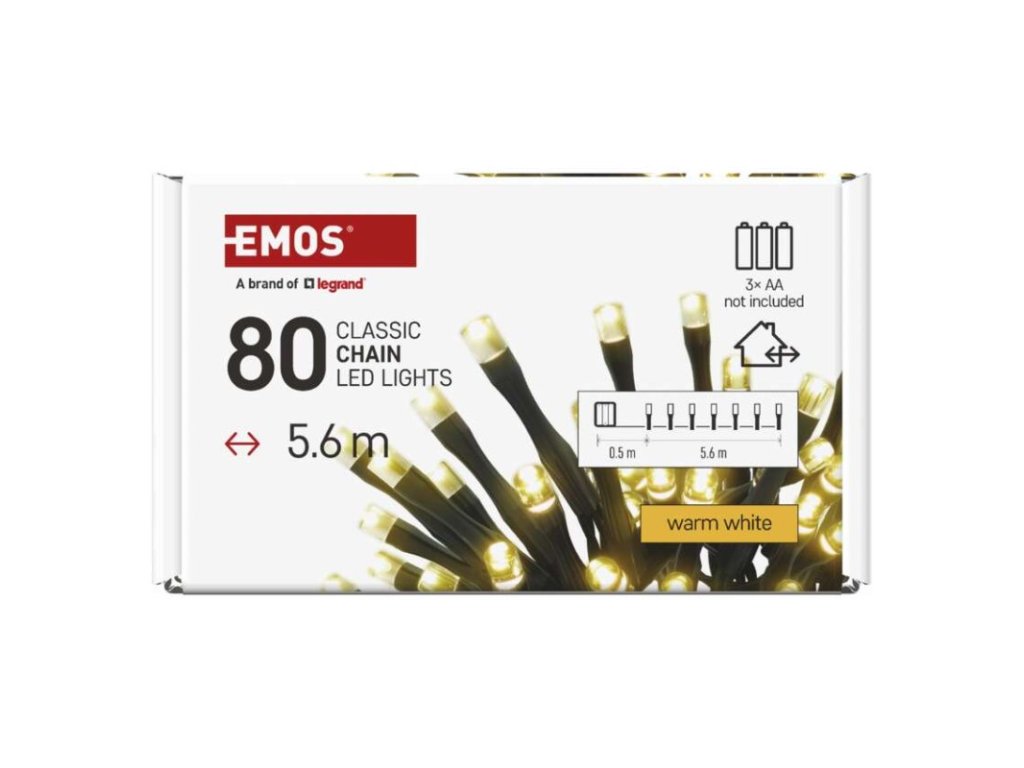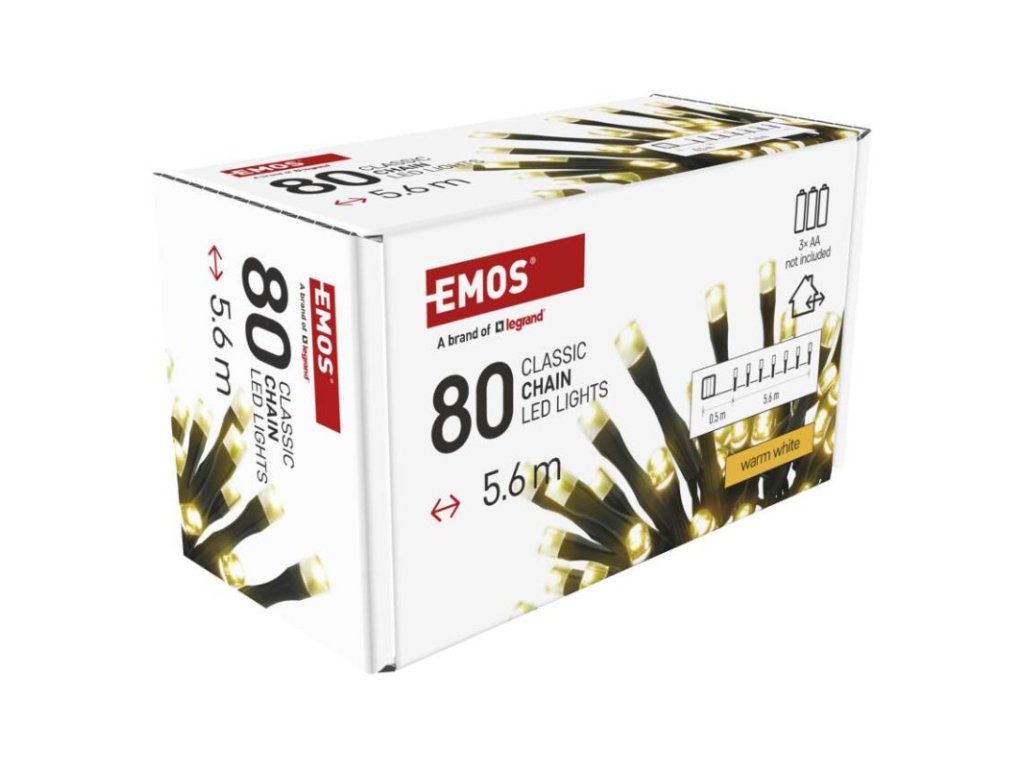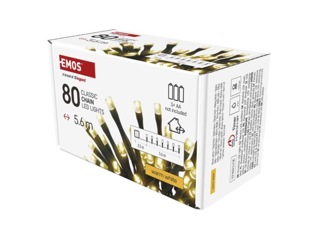 barva drátu: černá|barva světla: teplá bílá|časovač: ano|dálkový ovladač: ne|délka přívodu: 0,5 m|funkce: svítí|krytí: IP44|LED mezera: 7 cm|materiál: PVC|možnost propojení: ne|počet LED: 80|použití: venkovní i vnitřní|příkon: 0,9 W|prodejní obal: 1 ks, krabice|produkt: řetěz|pro výšku stromu: neuvádí se|rozměr: 5,6 m|tvar: klasický|typ napájení: baterie 3× AA (není součástí balení)|velikost LED: 5 mm|vstupní napětí: neuvádí se|výstupní napětí: 4,5 V DC|záruční doba: 2 roky|životnost: 10 000 hodin