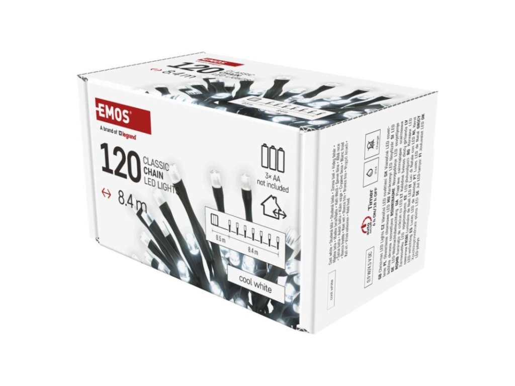 barva drátu: černá|barva světla: studená bílá|časovač: ano|dálkový ovladač: ne|délka přívodu: 0,5 m|funkce: svítí|krytí: IP44|LED mezera: neuvádí se|materiál: PVC|možnost propojení: ne|počet LED: 120|použití: venkovní i vnitřní|příkon: 0,9 W|prodejní obal: 1 ks, krabice|produkt: řetěz|pro výšku stromu: neuvádí se|rozměr: 8,4 m|tvar: neuvádí se|typ napájení: baterie 3× AA (není součástí balení)|velikost LED: neuvádí se|vstupní napětí: neuvádí se|výstupní napětí: 4,5 V DC|záruční doba: 2 roky|životnost: 10 000 hodin