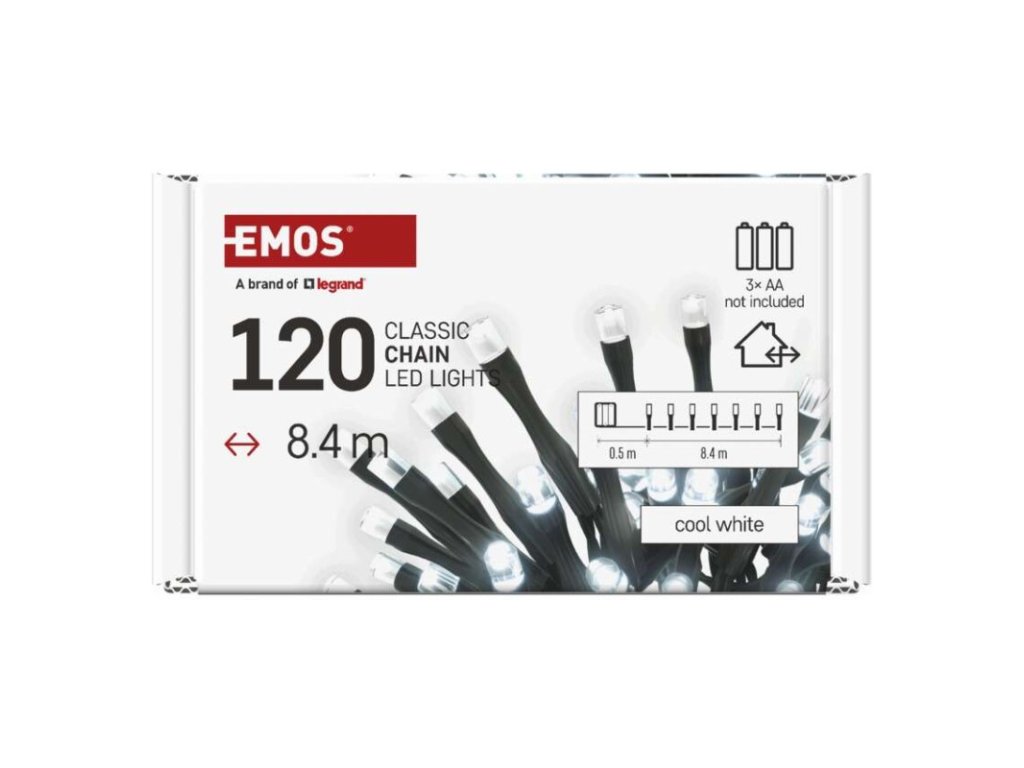 LED vánoční řetěz, 8,4 m, 3x AA, venkovní i vnitřní, studená bílá, časovač
