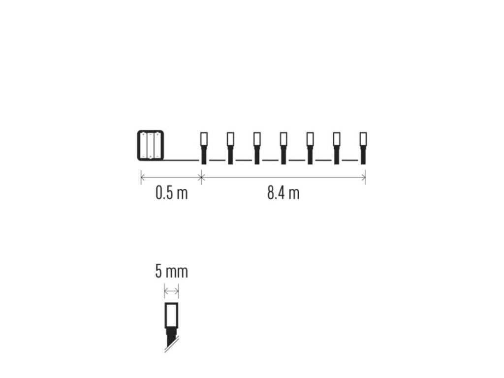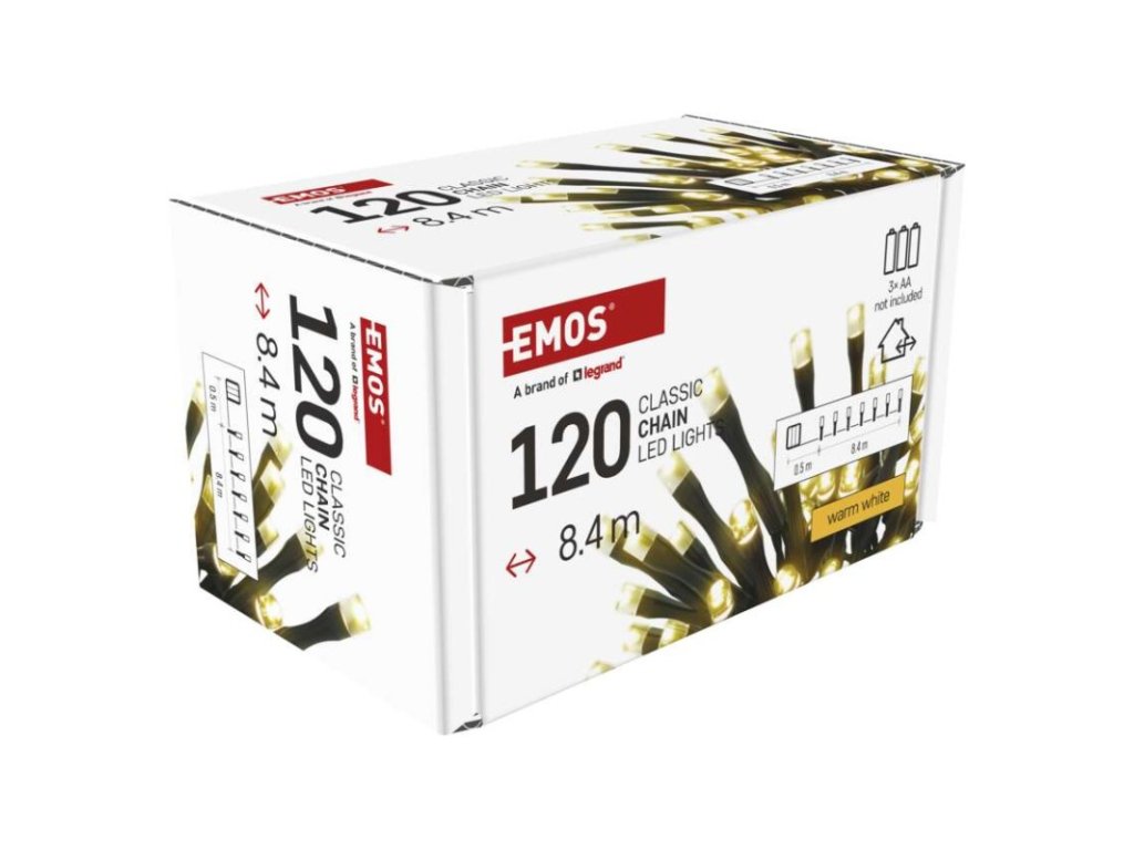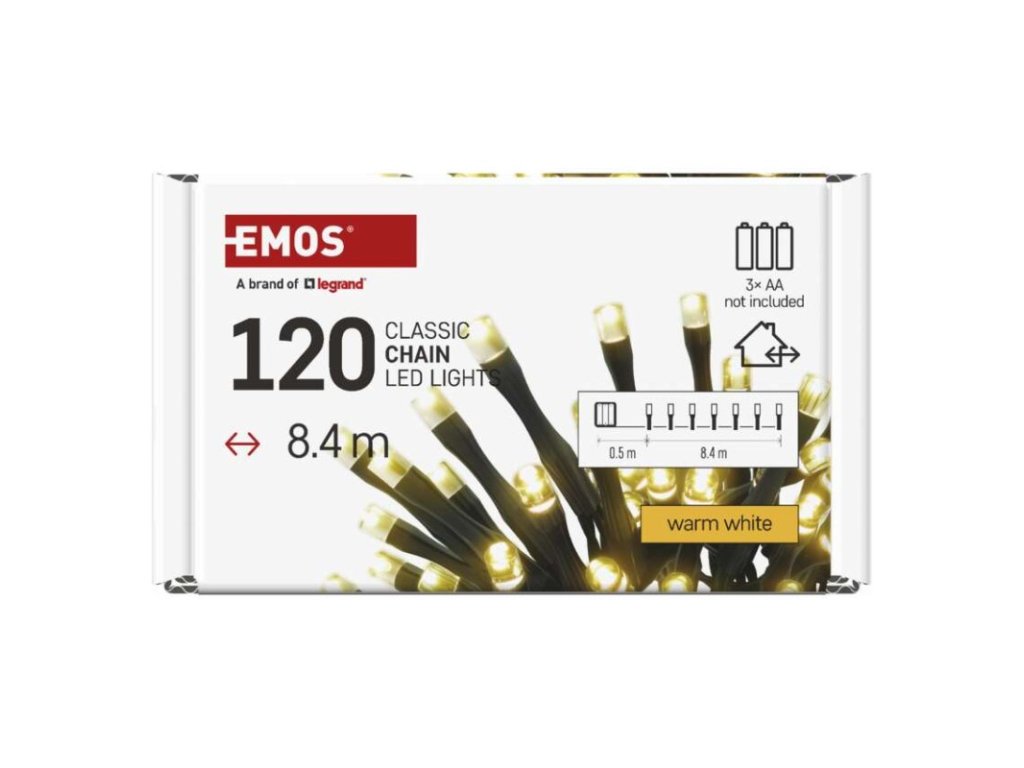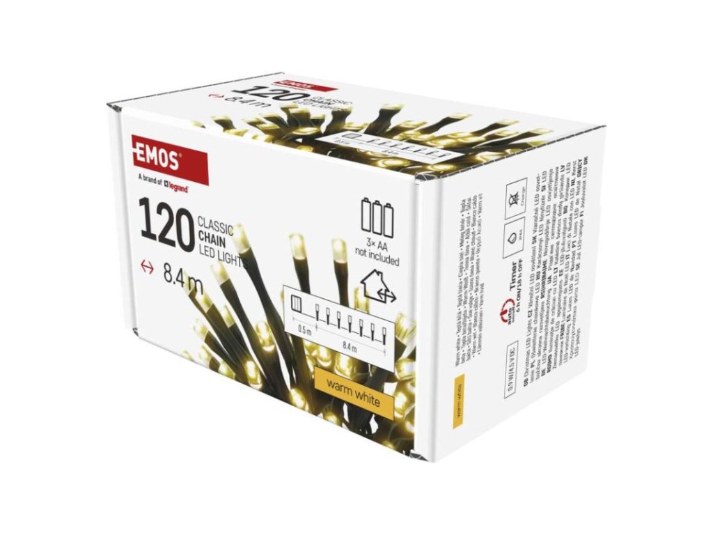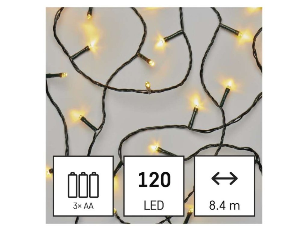 barva drátu: černá|barva světla: teplá bílá|časovač: ano|dálkový ovladač: ne|délka přívodu: 0,5 m|funkce: svítí|krytí: IP44|LED mezera: 7 cm|materiál: PVC|možnost propojení: ne|počet LED: 120|použití: venkovní i vnitřní|příkon: 0,9 W|prodejní obal: 1 ks, krabice|produkt: řetěz|pro výšku stromu: neuvádí se|rozměr: 8,4 m|tvar: klasický|typ napájení: baterie 3× AA (není součástí balení)|velikost LED: 5 mm|vstupní napětí: neuvádí se|výstupní napětí: 4,5 V DC|záruční doba: 2 roky|životnost: 10 000 hodin