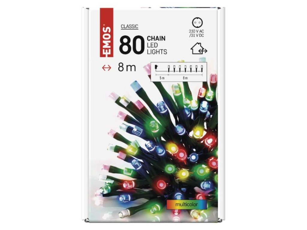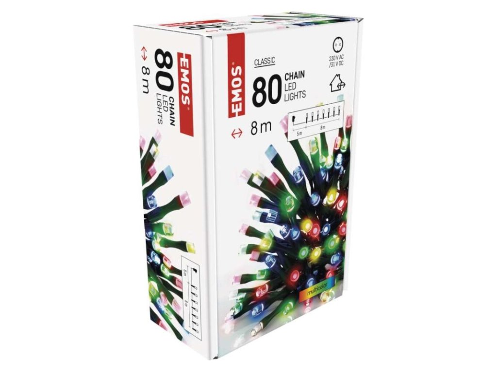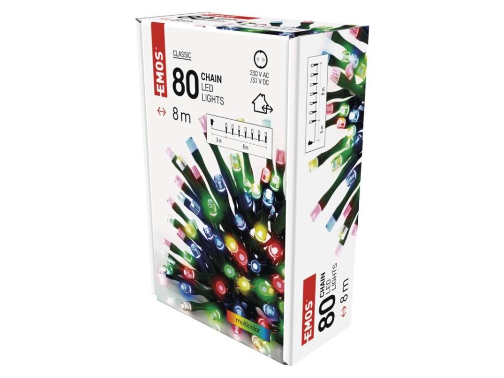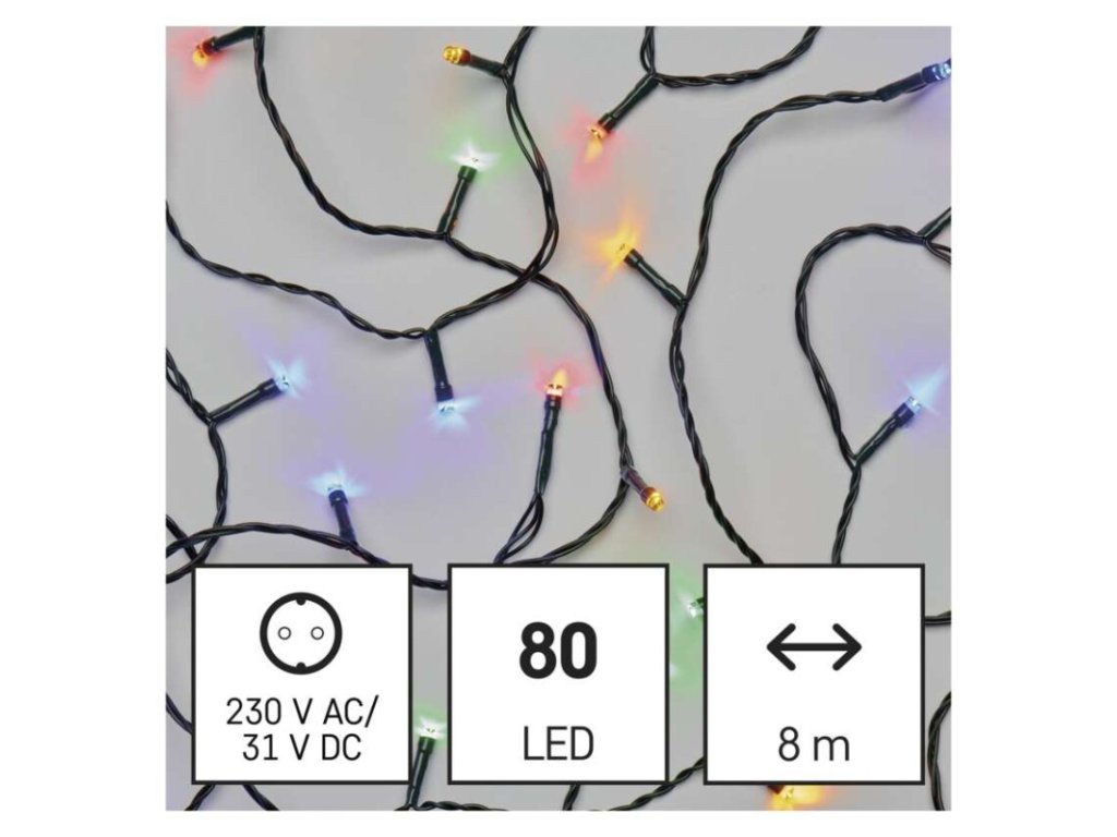 barva drátu: zelená|barva světla: multicolor|časovač: ano|dálkový ovladač: ne|délka přívodu: 5 m|funkce: svítí|krytí: IP44|LED mezera: 10 cm|materiál: PVC|možnost propojení: ne|počet LED: 80|použití: venkovní i vnitřní|příkon: 3,6 W|prodejní obal: 1 ks, krabice|produkt: řetěz|pro výšku stromu: 140 cm|rozměr: 8 m|tvar: klasický|typ napájení: síťový adaptér|velikost LED: 5 mm|vstupní napětí: 230 V AC|výstupní napětí: 31 V DC|záruční doba: 2 roky|životnost: 10 000 hodin
