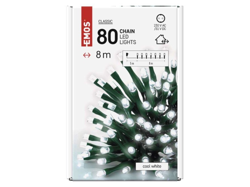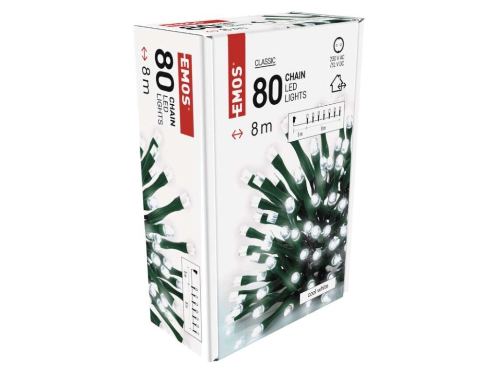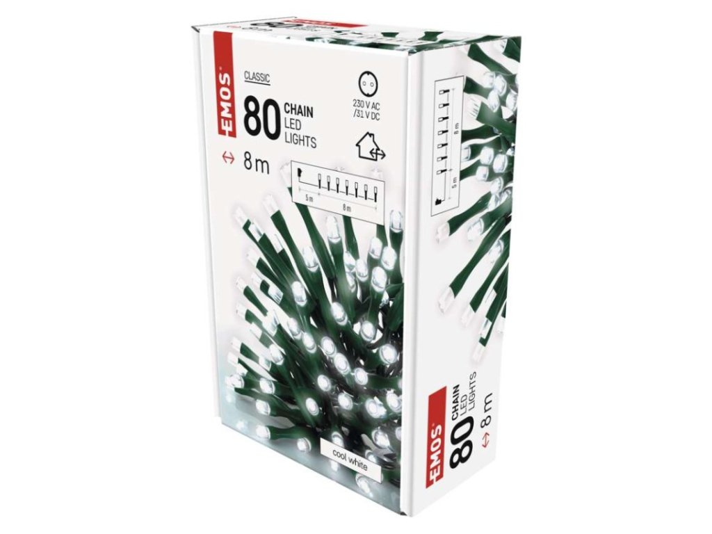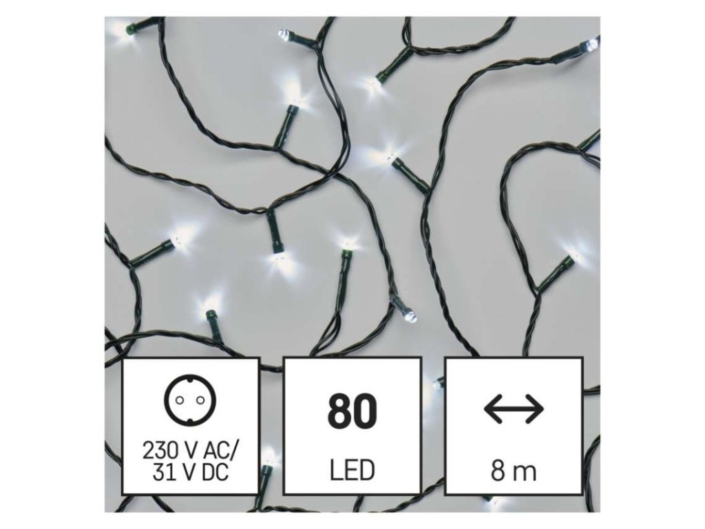 barva drátu: zelená|barva světla: studená bílá|časovač: ano|dálkový ovladač: ne|délka přívodu: 5 m|funkce: svítí|krytí: IP44|LED mezera: 10 cm|materiál: PVC|možnost propojení: ne|počet LED: 80|použití: venkovní i vnitřní|příkon: 3,6 W|prodejní obal: 1 ks, krabice|produkt: řetěz|pro výšku stromu: 140 cm|rozměr: 8 m|tvar: klasický|typ napájení: síťový adaptér|velikost LED: 5 mm|vstupní napětí: 230 V AC|výstupní napětí: 31 V DC|záruční doba: 2 roky|životnost: 10 000 hodin