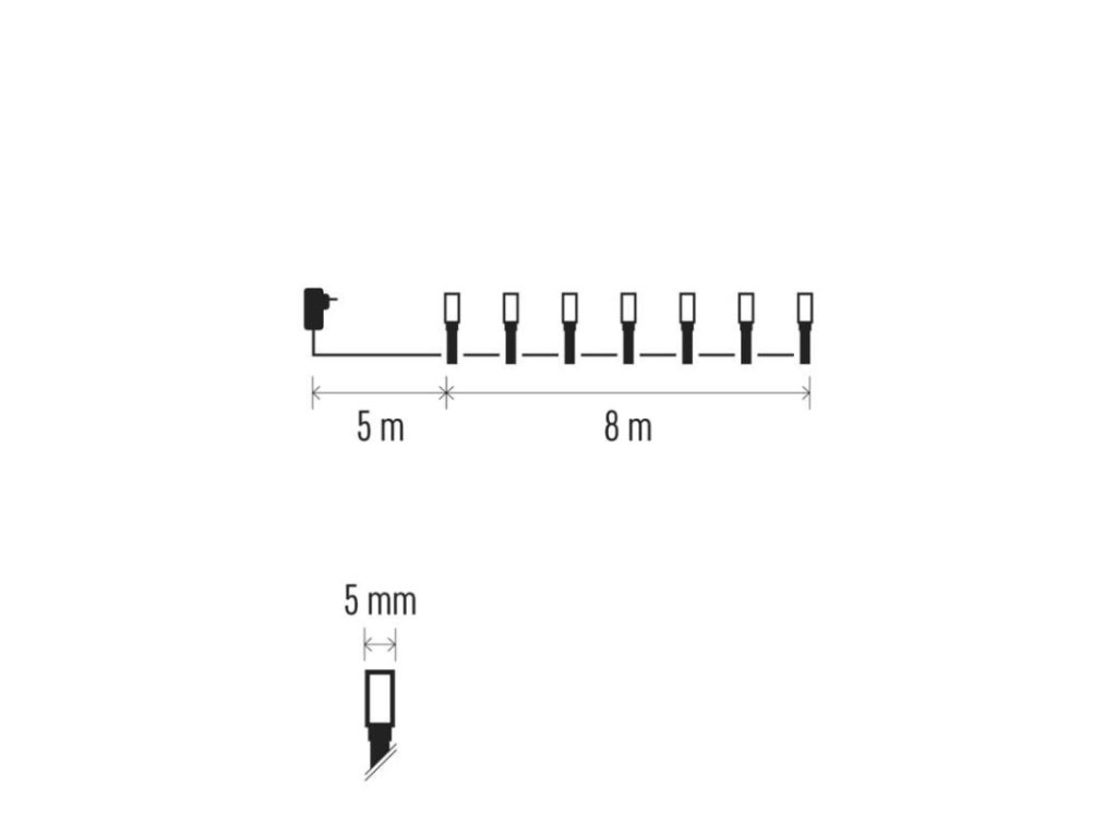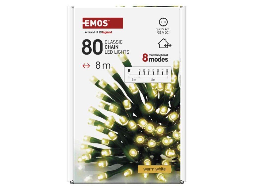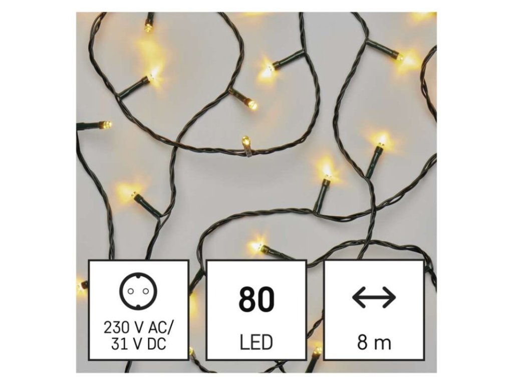 barva drátu: zelená|barva světla: teplá bílá|časovač: ano|dálkový ovladač: ne|další funkce: –|délka přívodu: 5 m|funkce: 8 módů (multifunkce)|jazyky aplikace: –|kompatibilita: –|krytí: IP44|LED mezera: 10 cm|materiál: PVC|možnost propojení: ne|notifikace do mobilní aplikace: ne|ovládání hlasovými asistenty: ne|počet LED: 80|podporované OS: –|použití: venkovní i vnitřní|přenosová frekvence: –|příkon: 3,6 W|prodejní obal: 1 ks, krabice|produkt: řetěz|protokol: –|pro výšku stromu: 140 cm|rozměr: 8 m|tvar: klasický|typ napájení: síťový adaptér|velikost LED: 5 mm|vstupní napětí: 230 V AC|výstupní napětí: 31 V DC|záruční doba: 2 roky|životnost: 10 000 hodin