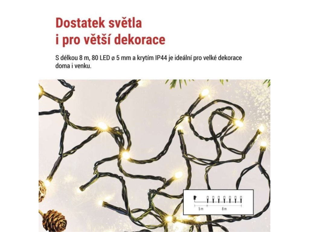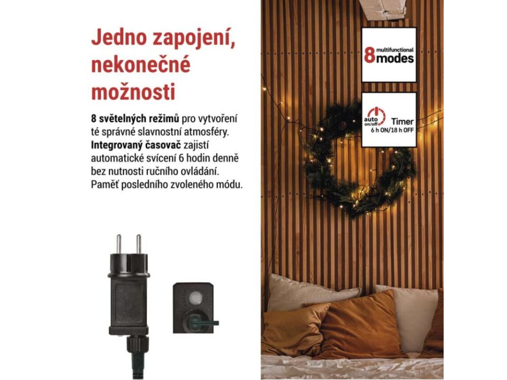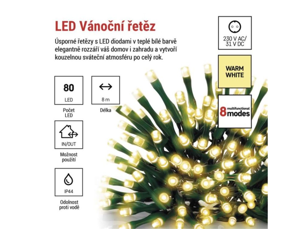 LED vánoční řetěz, 8 m, venkovní i vnitřní, teplá bílá, programy, časovač