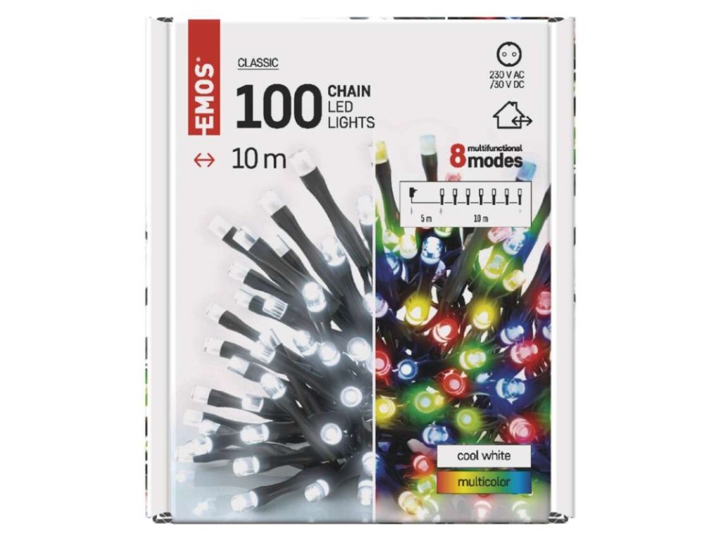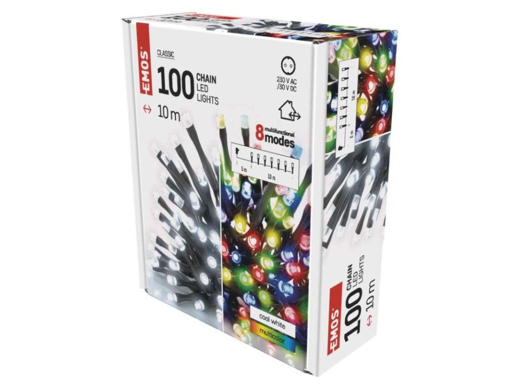 barva drátu: černá|barva světla: studená bílá/multicolor|časovač: ne|dálkový ovladač: ne|délka přívodu: 5 m|funkce: 8 módů (multifunkce)|krytí: IP44|LED mezera: 10 cm|materiál: PVC|možnost propojení: ne|počet LED: 100|použití: venkovní i vnitřní|příkon: 3,6 W|prodejní obal: 1 ks, krabice|produkt: řetěz|pro výšku stromu: 160 cm|rozměr: 10 m|tvar: klasický|typ napájení: síťový adaptér|velikost LED: 5 mm|vstupní napětí: 230 V AC|výstupní napětí: 31 V DC|záruční doba: 2 roky|životnost: 10 000 hodin
