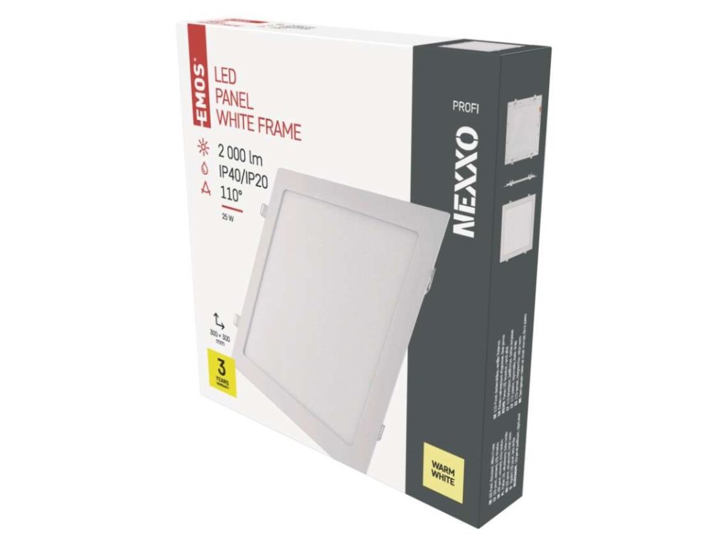 barva světla: teplá bílá|barva těla: bílá|dálkový ovladač: ne|do chodby a na schodiště: ano|do dílny a garáže: ne|do kanceláře: ano|do koupelny: ne|do kuchyně: ano|do obýváku, ložnice a dětského pokoje: ano|dosah senzoru: nemá senzor|flicker-free: ano|frekvence: 50/60 Hz|index podání barev (CRI): Ra > 82|kategorie: PROFI|krytí: IP40/IP20|materiál difuzoru: plast (PS)|materiál LGP: PMMA|materiál těla: hliník|montážní otvor: 280 × 280 mm|možnost stmívání: ne|náhrada za žárovku: 125 W|napětí: 220–240 V|na zahradu a balkon: ne|pohybový senzor: ne|příkon: 25 W|prodejní obal: 1 ks, krabice|proud: 111 mA|řada: NEXXO|rozměr: 300 × 300 × 21 mm|světelná účinnost: 83 lm/W|světelný tok: 2 000 lm|teplota chromatičnosti: 3 000 K|tvar: čtverec|typ difuzoru: mléčný|typ svítidla: klasické svítidlo|účiník: > 0,9|UGR<: neuvádí se|úhel vyzařování: 110°|umístění: stropní|výstupní proud ze zdroje: 300 mA|záruční doba: 3 roky|zdroj světla: LED|životnost: 30 000 hodin|způsob montáže: vestavné