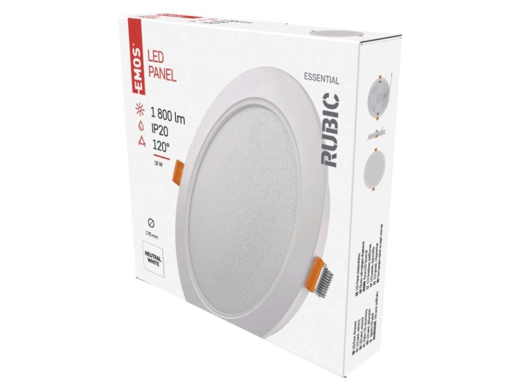 barva světla: neutrální bílá|barva těla: bílá|dálkový ovladač: ne|do chodby a na schodiště: ano|do dílny a garáže: ne|do kanceláře: ne|do koupelny: ne|do kuchyně: ano|do obýváku, ložnice a dětského pokoje: ne|dosah senzoru: nemá senzor|flicker-free: ano|frekvence: 50/60 Hz|index podání barev (CRI): Ra > 80|kategorie: ESSENTIAL|krytí: IP20|materiál difuzoru: plast (PC)|materiál LGP: neuvádí se|materiál těla: plast (PC)|montážní otvor: 140–160 mm|možnost stmívání: ne|náhrada za žárovku: 110 W|napětí: 220–240 V|na zahradu a balkon: ne|pohybový senzor: ne|příkon: 18 W|prodejní obal: 1 ks, krabice|proud: 157 mA|řada: RUBIC|rozměr: průměr 170 × 26 mm|světelná účinnost: 100 lm/W|světelný tok: 1 800 lm|teplota chromatičnosti: 4 000 K|tvar: kruh|typ difuzoru: mléčný|typ svítidla: klasické svítidlo|účiník: > 0,7|UGR<: neuvádí se|úhel vyzařování: 120°|umístění: stropní|výstupní proud ze zdroje: 50 mA|záruční doba: 2 roky|zdroj světla: LED|životnost: 25 000 hodin|způsob montáže: vestavné