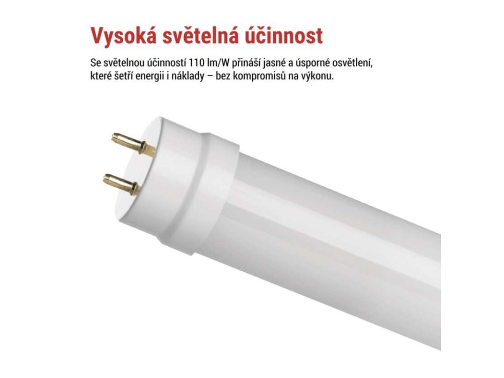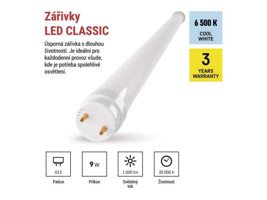 barva světla: studená bílá|energetická třída: E|index podání barev (CRI): 80|kompatibilita: –|náhrada za žárovku: neuvádí se|napětí: 230 V~/50 Hz|notifikace do mobilní aplikace: –|ovládání hlasovými asistenty: –|patice (uchycení žárovky): G13|počet čipů: neuvádí se|počet spínacích cyklů: 20 000|podporované OS: –|přenosová frekvence: –|příkon: 9 W|prodejní obal: 25 ks, krabička|protokol: –|řada: CLASSIC|rozměr: 600 × 26 × 26 mm|stmívatelná: ne|světelná účinnost: 111 lm/W|světelný tok: 1 000 lm|technologie: LED|teplota chromatičnosti: 6 500 K|tvar: T8|typ čipů: SMD|účiník: 0,5|úhel vyzařování: 260°|záruční doba: 3 roky|životnost: 30 000 hodin