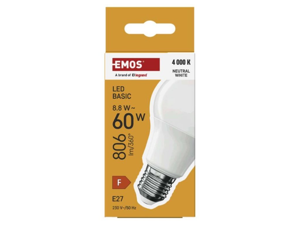 barva světla: neutrální bílá|energetická třída: F|index podání barev (CRI): 80|kompatibilita: –|náhrada za žárovku: 60 W|napětí: 230 V~/50 Hz|notifikace do mobilní aplikace: ne|ovládání hlasovými asistenty: ne|patice (uchycení žárovky): E27|počet čipů: neuvádí se|počet spínacích cyklů: 20 000|podporované OS: –|přenosová frekvence: –|příkon: 8,8 W|prodejní obal: 1 ks, krabička|protokol: –|řada: BASIC|rozměr: 60 × 60 × 110 (max.) mm|stmívatelná: ne|světelná účinnost: 92 lm/W|světelný tok: 806 lm|technologie: LED|teplota chromatičnosti: 4 000 K|tvar: A60|typ čipů: SMD|účiník: 0,50|úhel vyzařování: 200°|záruční doba: 2 roky|životnost: 20 000 hodin