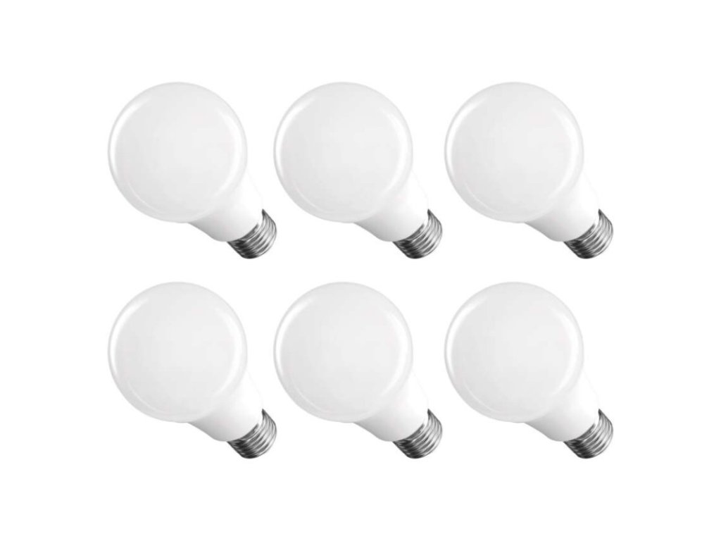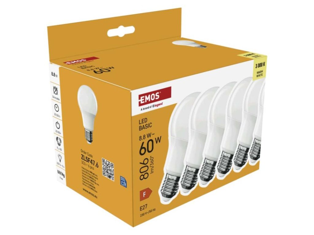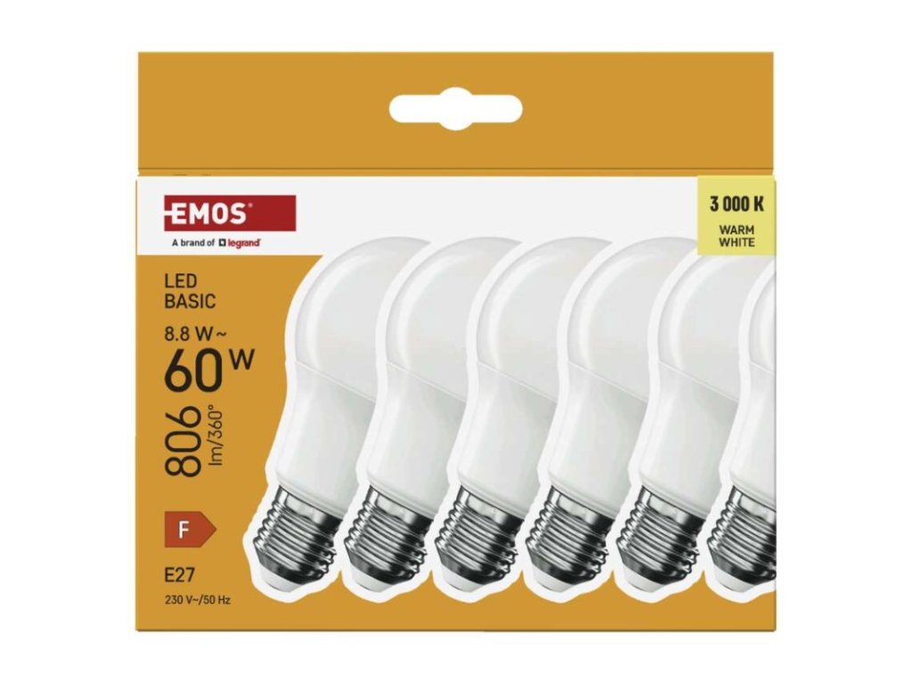 barva světla: teplá bílá|energetická třída: F|index podání barev (CRI): 80|kompatibilita: –|náhrada za žárovku: 60 W|napětí: 230 V~/50 Hz|notifikace do mobilní aplikace: ne|ovládání hlasovými asistenty: ne|patice (uchycení žárovky): E27|počet čipů: neuvádí se|počet spínacích cyklů: 20 000|podporované OS: –|přenosová frekvence: –|příkon: 8,8 W|prodejní obal: 6 ks, krabička|protokol: –|řada: BASIC|rozměr: 60 × 60 × 110 (max.) mm|stmívatelná: ne|světelná účinnost: 92 lm/W|světelný tok: 806 lm|technologie: LED|teplota chromatičnosti: 3 000 K|tvar: A60|typ čipů: SMD|účiník: 0,50|úhel vyzařování: 200°|záruční doba: 2 roky|životnost: 20 000 hodin