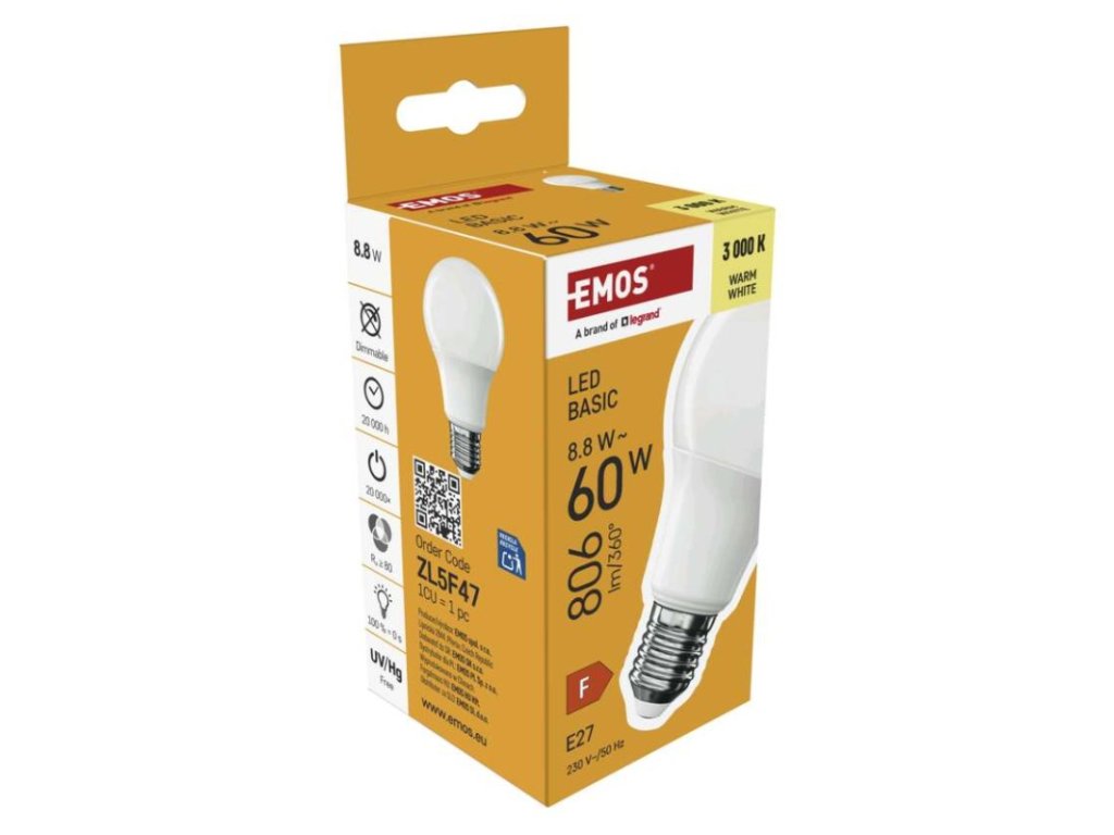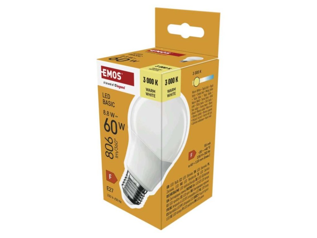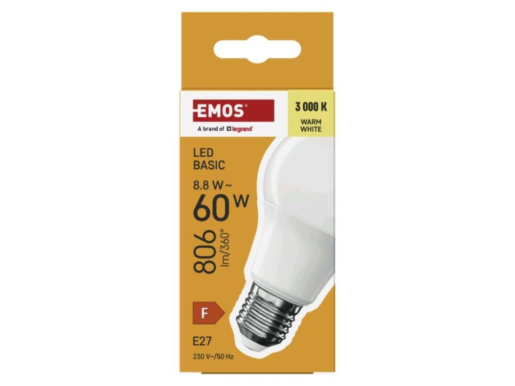 barva světla: teplá bílá|energetická třída: F|index podání barev (CRI): 80|kompatibilita: –|náhrada za žárovku: 60 W|napětí: 230 V~/50 Hz|notifikace do mobilní aplikace: ne|ovládání hlasovými asistenty: ne|patice (uchycení žárovky): E27|počet čipů: neuvádí se|počet spínacích cyklů: 20 000|podporované OS: –|přenosová frekvence: –|příkon: 8,8 W|prodejní obal: 1 ks, krabička|protokol: –|řada: BASIC|rozměr: 60 × 60 × 110 (max.) mm|stmívatelná: ne|světelná účinnost: 92 lm/W|světelný tok: 806 lm|technologie: LED|teplota chromatičnosti: 3 000 K|tvar: A60|typ čipů: SMD|účiník: 0,50|úhel vyzařování: 200°|záruční doba: 2 roky|životnost: 20 000 hodin