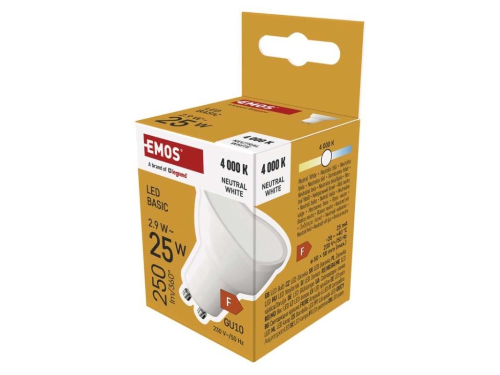 barva světla: neutrální bílá|energetická třída: F|index podání barev (CRI): 80|kompatibilita: –|náhrada za žárovku: 25 W|napětí: 230 V~/50 Hz|notifikace do mobilní aplikace: ne|ovládání hlasovými asistenty: ne|patice (uchycení žárovky): GU10|počet čipů: neuvádí se|počet spínacích cyklů: 20 000|podporované OS: –|přenosová frekvence: –|příkon: 2,9 W|prodejní obal: 1 ks, krabička|protokol: –|řada: BASIC|rozměr: 50 × 50 × 58 (max.) mm|stmívatelná: ne|světelná účinnost: 86 lm/W|světelný tok: 250 lm|technologie: LED|teplota chromatičnosti: 4 000 K|tvar: MR16|typ čipů: SMD|účiník: 0,50|úhel vyzařování: 110°|záruční doba: 2 roky|životnost: 20 000 hodin