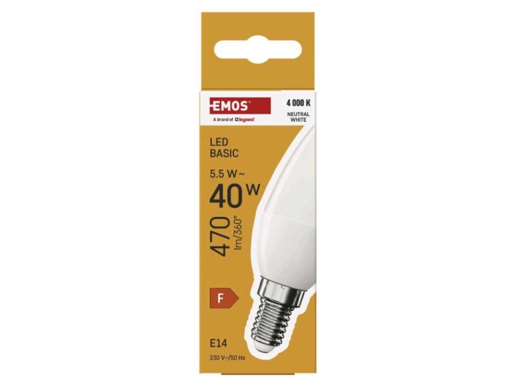 barva světla: neutrální bílá|energetická třída: F|index podání barev (CRI): 80|kompatibilita: neuvádí se|náhrada za žárovku: 40 W|napětí: 230 V~/50 Hz|notifikace do mobilní aplikace: neuvádí se|ovládání hlasovými asistenty: neuvádí se|patice (uchycení žárovky): E14|počet čipů: neuvádí se|počet spínacích cyklů: 20 000|podporované OS: neuvádí se|přenosová frekvence: neuvádí se|příkon: 5,5 W|prodejní obal: 1 ks, krabička|protokol: neuvádí se|řada: BASIC|rozměr: 35 × 35 × 110 mm|stmívatelná: ne|světelná účinnost: 85 lm/W|světelný tok: 470 lm|technologie: LED|teplota chromatičnosti: 4 000 K|tvar: svíčka|typ čipů: SMD|účiník: 0,50|úhel vyzařování: 180°|záruční doba: 2 roky|životnost: 20 000 hodin
