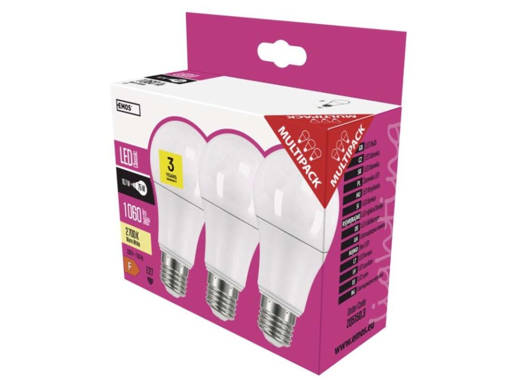 barva světla: teplá bílá|energetická třída: F|index podání barev (CRI): 83|kompatibilita: –|náhrada za žárovku: 75 W|napětí: 230 V~/50 Hz|notifikace do mobilní aplikace: –|ovládání hlasovými asistenty: –|patice (uchycení žárovky): E27|počet čipů: neuvádí se|počet spínacích cyklů: 25 000|podporované OS: –|přenosová frekvence: –|příkon: 10,7 W|prodejní obal: 3 ks, krabička|protokol: –|řada: CLASSIC|rozměr: 120 × 60 × 60 mm|stmívatelná: ne|světelná účinnost: 99 lm/W|světelný tok: 1 060 lm|technologie: LED|teplota chromatičnosti: 2 700 K|tvar: A60|typ čipů: SMD|účiník: 0,56|úhel vyzařování: 180°|záruční doba: 3 roky|životnost: 30 000 hodin