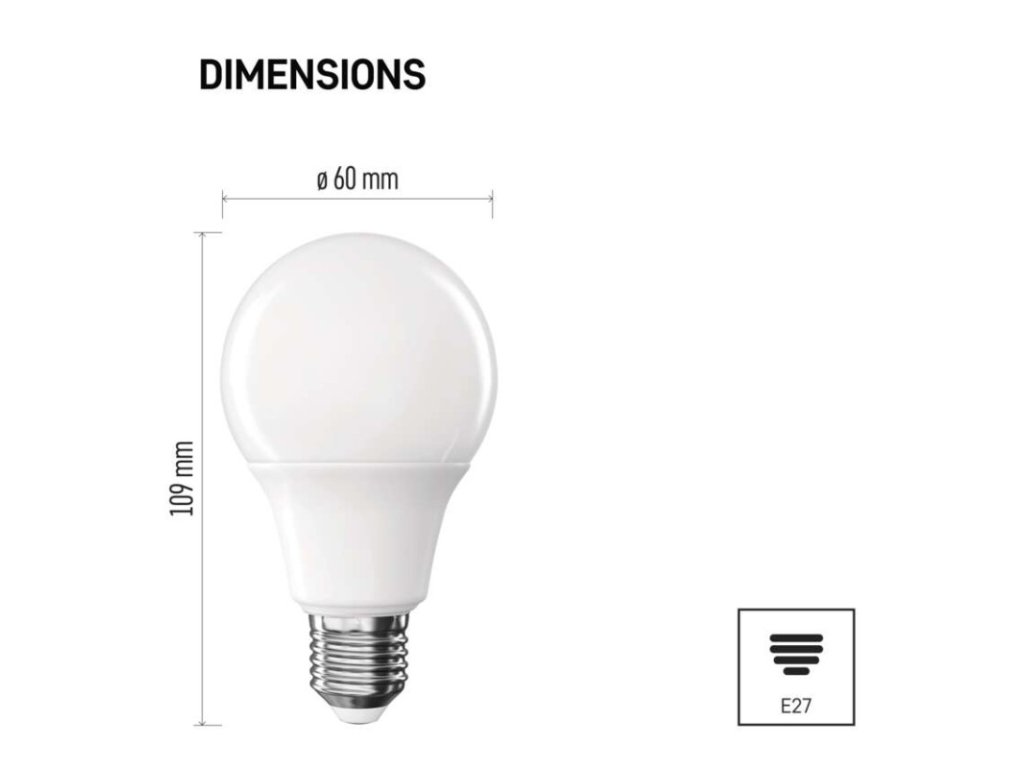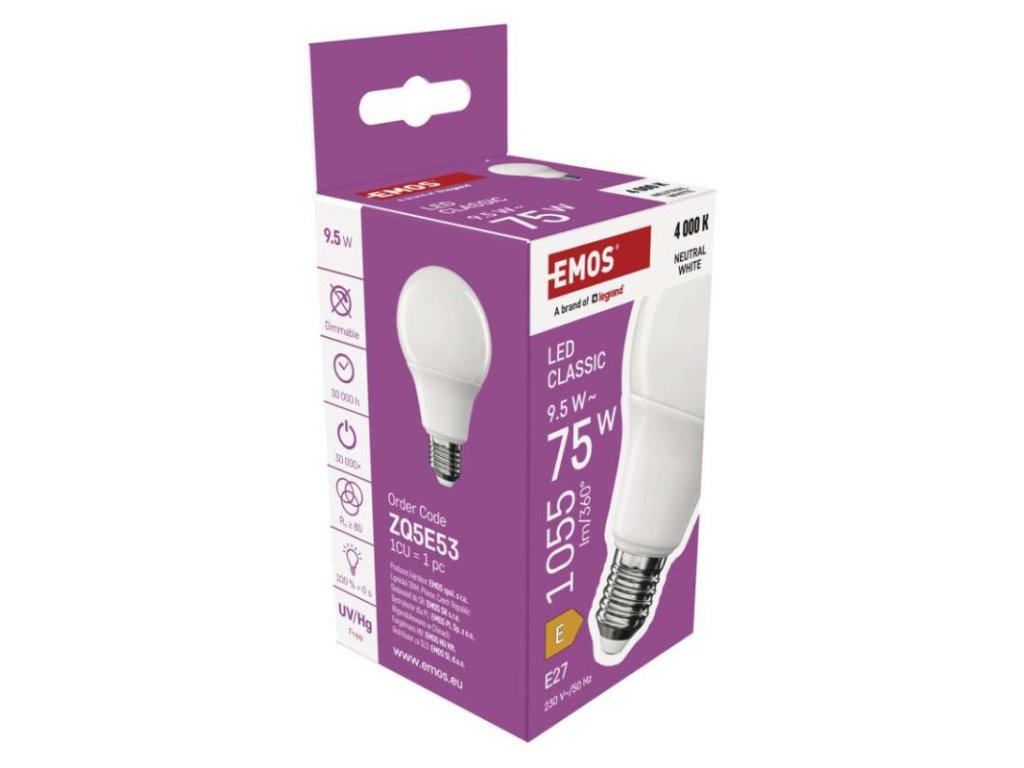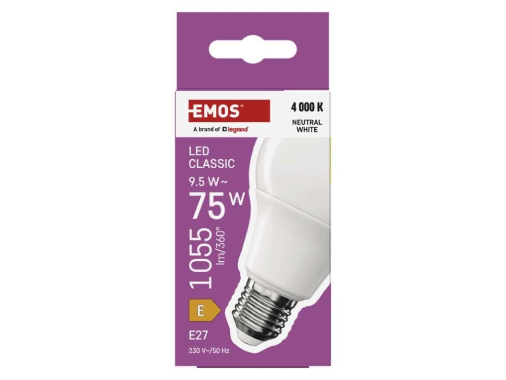 barva světla: neutrální bílá|energetická třída: E|index podání barev (CRI): 80|kompatibilita: –|náhrada za žárovku: 75 W|napětí: 230 V~/50 Hz|notifikace do mobilní aplikace: ne|ovládání hlasovými asistenty: ne|patice (uchycení žárovky): E27|počet čipů: neuvádí se|počet spínacích cyklů: 30 000|podporované OS: –|přenosová frekvence: –|příkon: 9,5 W|prodejní obal: 1 ks, krabička|protokol: –|řada: CLASSIC|rozměr: 60 × 60 × 109 mm|stmívatelná: ne|světelná účinnost: 111 lm/W|světelný tok: 1 055 lm|technologie: LED|teplota chromatičnosti: 4 000 K|tvar: A60|typ čipů: SMD|účiník: 0,50|úhel vyzařování: 180°|záruční doba: 3 roky|životnost: 30 000 hodin