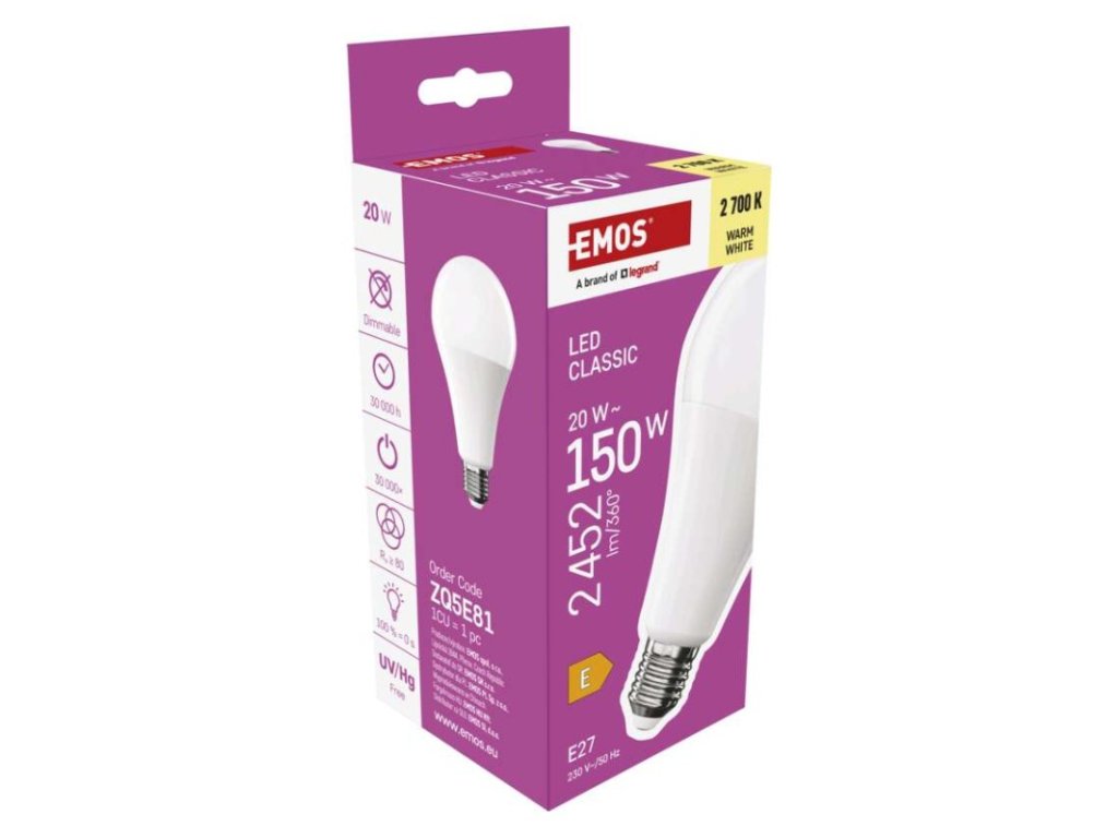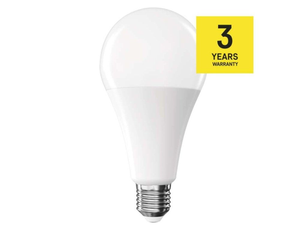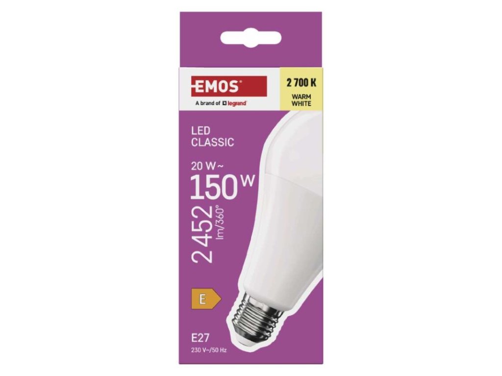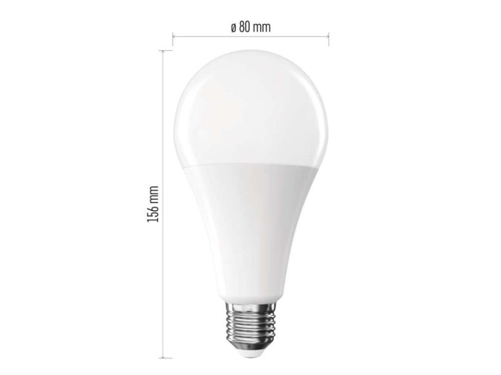 barva světla: teplá bílá|energetická třída: E|index podání barev (CRI): 80|kompatibilita: –|náhrada za žárovku: 150 W|napětí: 230 V~/50 Hz|notifikace do mobilní aplikace: ne|ovládání hlasovými asistenty: ne|patice (uchycení žárovky): E27|počet čipů: neuvádí se|počet spínacích cyklů: 30 000|podporované OS: –|přenosová frekvence: –|příkon: 20 W|prodejní obal: 1 ks, krabička|protokol: –|řada: CLASSIC|rozměr: 80 × 80 × 156 mm|stmívatelná: ne|světelná účinnost: 123 lm/W|světelný tok: 2 452 lm|technologie: LED|teplota chromatičnosti: 2 700 K|tvar: A80|typ čipů: SMD|účiník: 0,50|úhel vyzařování: 180°|záruční doba: 3 roky|životnost: 30 000 hodin