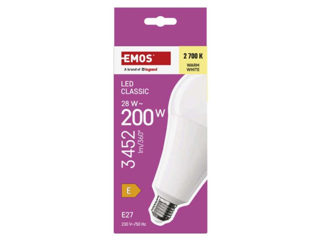 barva světla: teplá bílá|energetická třída: E|index podání barev (CRI): 80|kompatibilita: neuvádí se|náhrada za žárovku: 200 W|napětí: 230 V~/50 Hz|notifikace do mobilní aplikace: neuvádí se|ovládání hlasovými asistenty: neuvádí se|patice (uchycení žárovky): E27|počet čipů: neuvádí se|počet spínacích cyklů: 30 000|podporované OS: neuvádí se|přenosová frekvence: neuvádí se|příkon: 28 W|prodejní obal: 1 ks, krabička|protokol: neuvádí se|řada: CLASSIC|rozměr: 95 × 95 × 178 mm|stmívatelná: ne|světelná účinnost: 123 lm/W|světelný tok: 3 452 lm|technologie: LED|teplota chromatičnosti: 2 700 K|tvar: A95|typ čipů: SMD|účiník: 0,90|úhel vyzařování: 180°|záruční doba: 3 roky|životnost: 30 000 hodin