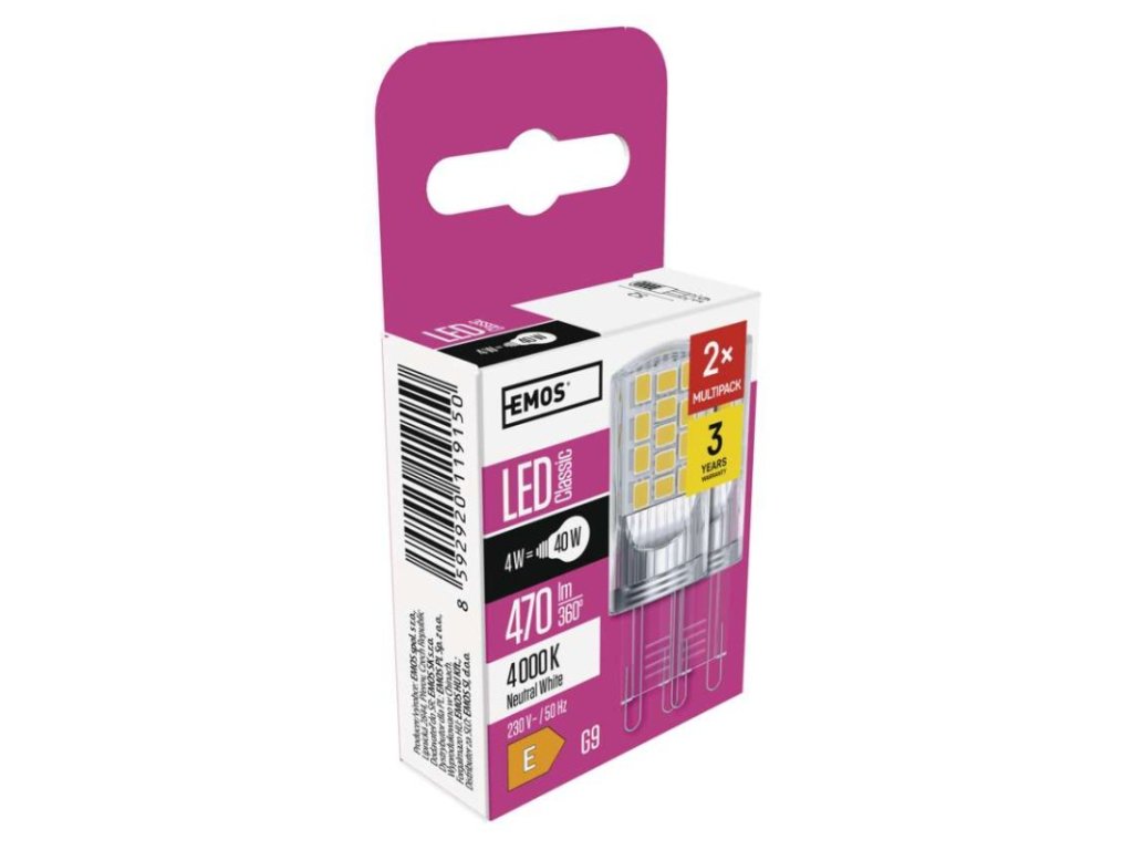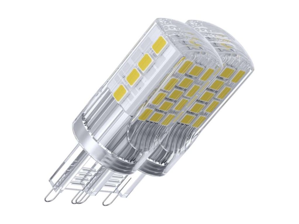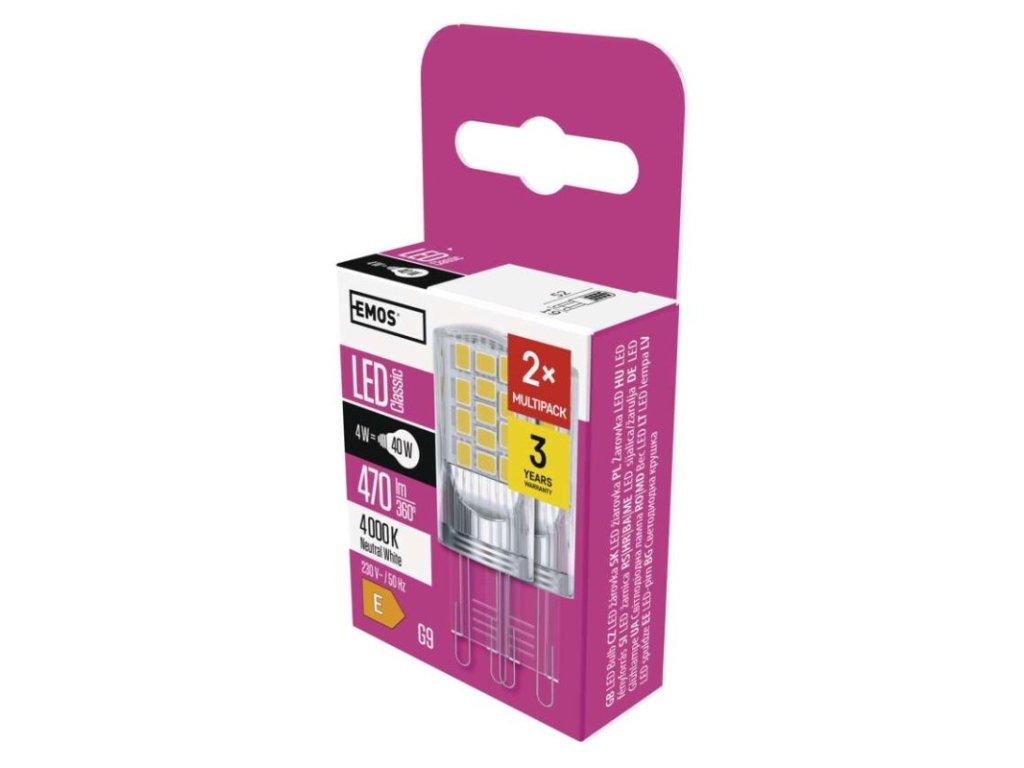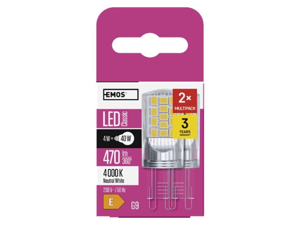 barva světla: neutrální bílá|energetická třída: E|index podání barev (CRI): 80|kompatibilita: –|náhrada za žárovku: 40 W|napětí: 230 V~/50 Hz|notifikace do mobilní aplikace: –|ovládání hlasovými asistenty: –|patice (uchycení žárovky): G9|počet čipů: 34|počet spínacích cyklů: 25 000|podporované OS: –|přenosová frekvence: –|příkon: 4 W|prodejní obal: 2 ks, krabička|protokol: –|řada: CLASSIC|rozměr: 52 × 19 × 19 mm|stmívatelná: ne|světelná účinnost: 118 lm/W|světelný tok: 470 lm|technologie: LED|teplota chromatičnosti: 4 000 K|tvar: JC|typ čipů: SMD|účiník: 0,47|úhel vyzařování: 320°|záruční doba: 3 roky|životnost: 30 000 hodin