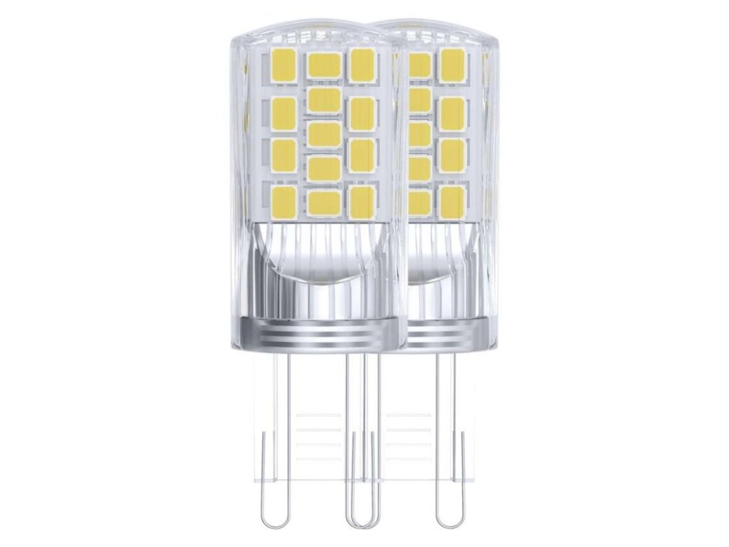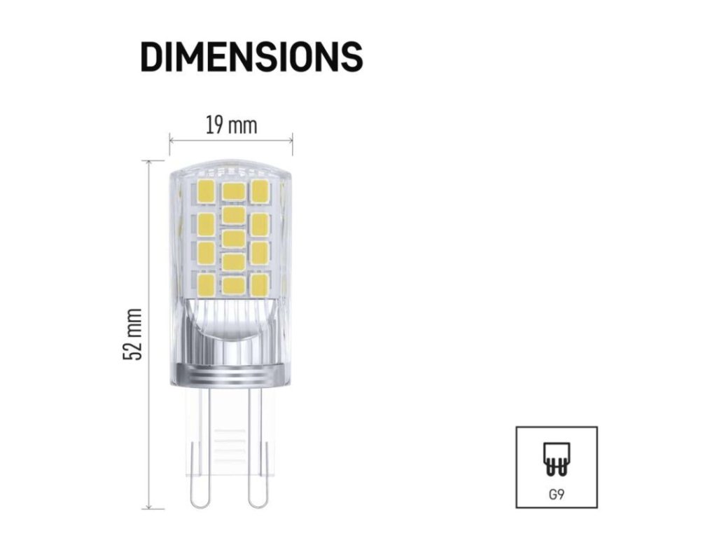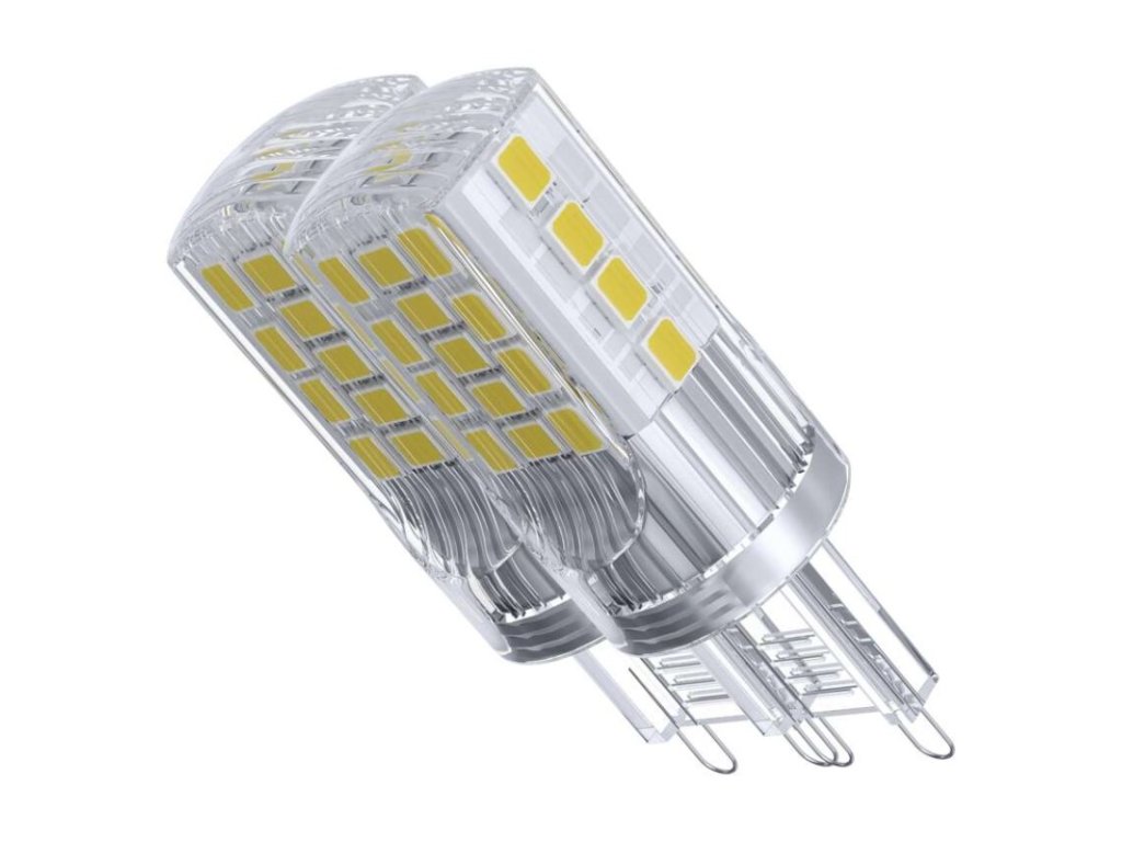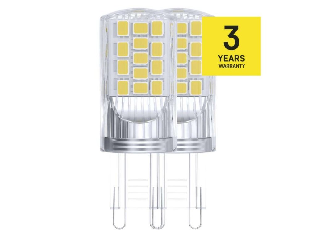barva světla: neutrální bílá|energetická třída: E|index podání barev (CRI): 80|kompatibilita: –|náhrada za žárovku: 40 W|napětí: 230 V~/50 Hz|notifikace do mobilní aplikace: –|ovládání hlasovými asistenty: –|patice (uchycení žárovky): G9|počet čipů: 34|počet spínacích cyklů: 25 000|podporované OS: –|přenosová frekvence: –|příkon: 4 W|prodejní obal: 2 ks, krabička|protokol: –|řada: CLASSIC|rozměr: 52 × 19 × 19 mm|stmívatelná: ne|světelná účinnost: 118 lm/W|světelný tok: 470 lm|technologie: LED|teplota chromatičnosti: 4 000 K|tvar: JC|typ čipů: SMD|účiník: 0,47|úhel vyzařování: 320°|záruční doba: 3 roky|životnost: 30 000 hodin