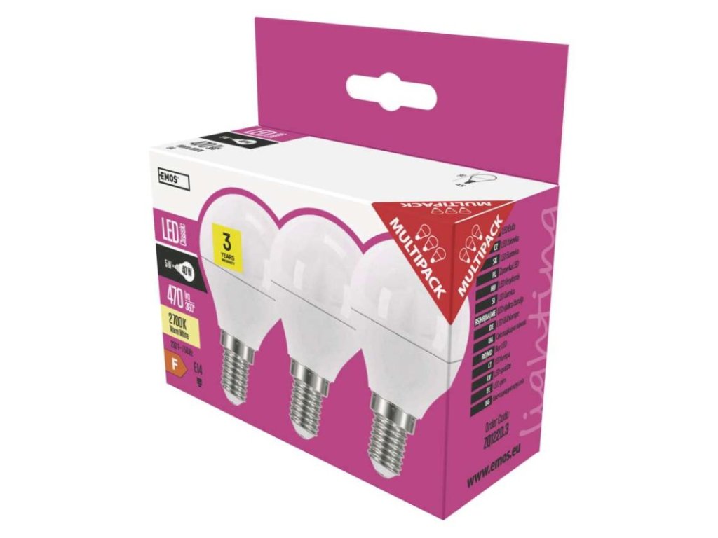 barva světla: teplá bílá|energetická třída: F|index podání barev (CRI): 80|kompatibilita: –|náhrada za žárovku: 40 W|napětí: 230 V~/50 Hz|notifikace do mobilní aplikace: –|ovládání hlasovými asistenty: –|patice (uchycení žárovky): E14|počet čipů: 8|počet spínacích cyklů: 25 000|podporované OS: –|přenosová frekvence: –|příkon: 5 W|prodejní obal: 3 ks, krabička|protokol: –|řada: CLASSIC|rozměr: 78 × 45 × 45 mm|stmívatelná: ne|světelná účinnost: 78 lm/W|světelný tok: 470 lm|technologie: LED|teplota chromatičnosti: 2 700 K|tvar: Mini Globe|typ čipů: 2835|účiník: 0,5|úhel vyzařování: 220°|záruční doba: 3 roky|životnost: 30 000 hodin