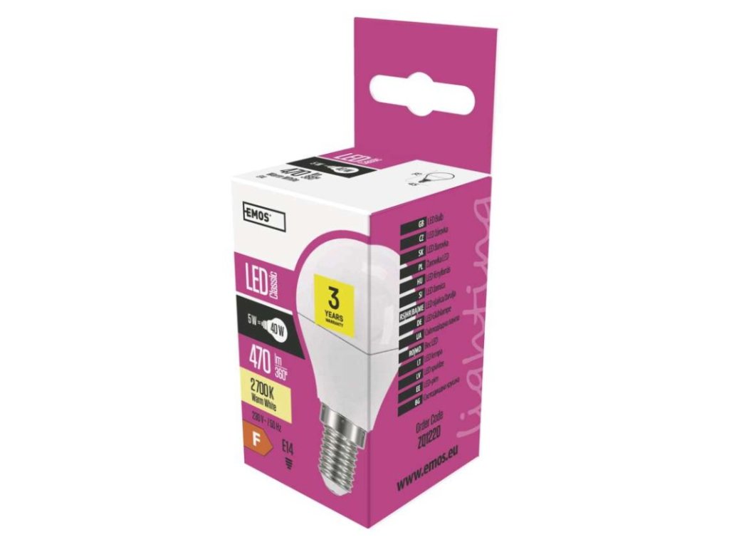barva světla: teplá bílá|energetická třída: F|index podání barev (CRI): 80|kompatibilita: –|náhrada za žárovku: 40 W|napětí: 230 V~/50 Hz|notifikace do mobilní aplikace: –|ovládání hlasovými asistenty: –|patice (uchycení žárovky): E14|počet čipů: neuvádí se|počet spínacích cyklů: 25 000|podporované OS: –|přenosová frekvence: –|příkon: 5 W|prodejní obal: 1 ks, krabička|protokol: –|řada: CLASSIC|rozměr: 78 × 45 × 45 mm|stmívatelná: ne|světelná účinnost: 94 lm/W|světelný tok: 470 lm|technologie: LED|teplota chromatičnosti: 2 700 K|tvar: Mini Globe|typ čipů: SMD|účiník: 0,53|úhel vyzařování: 220°|záruční doba: 3 roky|životnost: 30 000 hodin