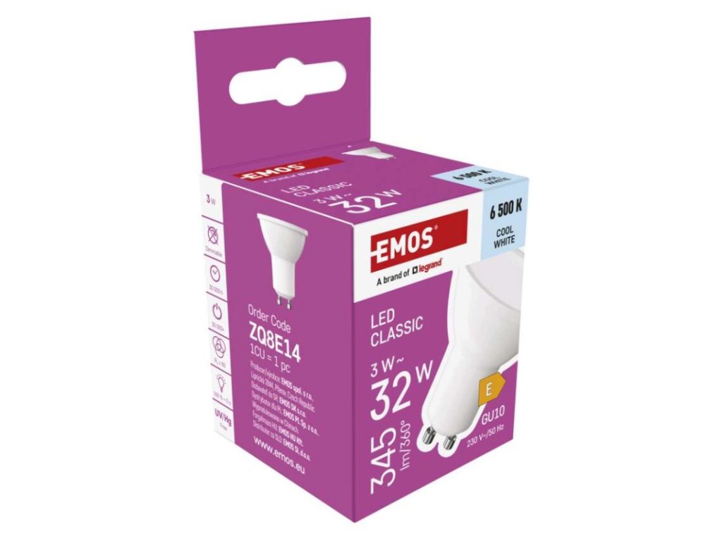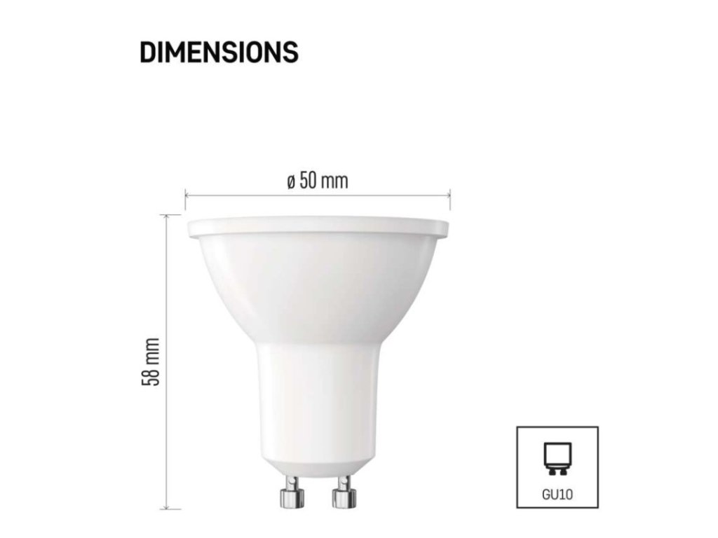 barva světla: studená bílá|energetická třída: E|index podání barev (CRI): 80|kompatibilita: –|náhrada za žárovku: 32 W|napětí: 230 V~/50 Hz|notifikace do mobilní aplikace: ne|ovládání hlasovými asistenty: ne|patice (uchycení žárovky): GU10|počet čipů: neuvádí se|počet spínacích cyklů: 30 000|podporované OS: –|přenosová frekvence: –|příkon: 3 W|prodejní obal: 1 ks, krabička|protokol: –|řada: CLASSIC|rozměr: 50 × 50 × 58 mm|stmívatelná: ne|světelná účinnost: 115 lm/W|světelný tok: 345 lm|technologie: LED|teplota chromatičnosti: 6 500 K|tvar: MR16|typ čipů: SMD|účiník: 0,40|úhel vyzařování: 100°|záruční doba: 3 roky|životnost: 30 000 hodin