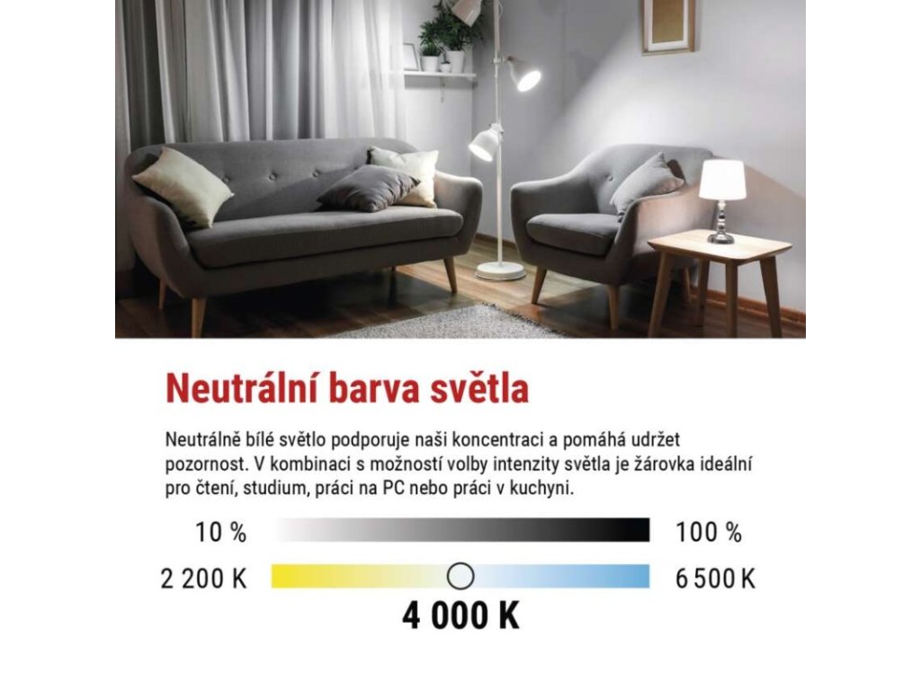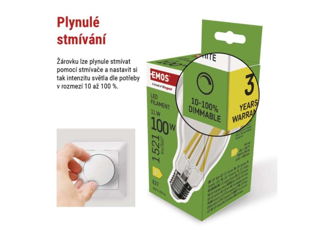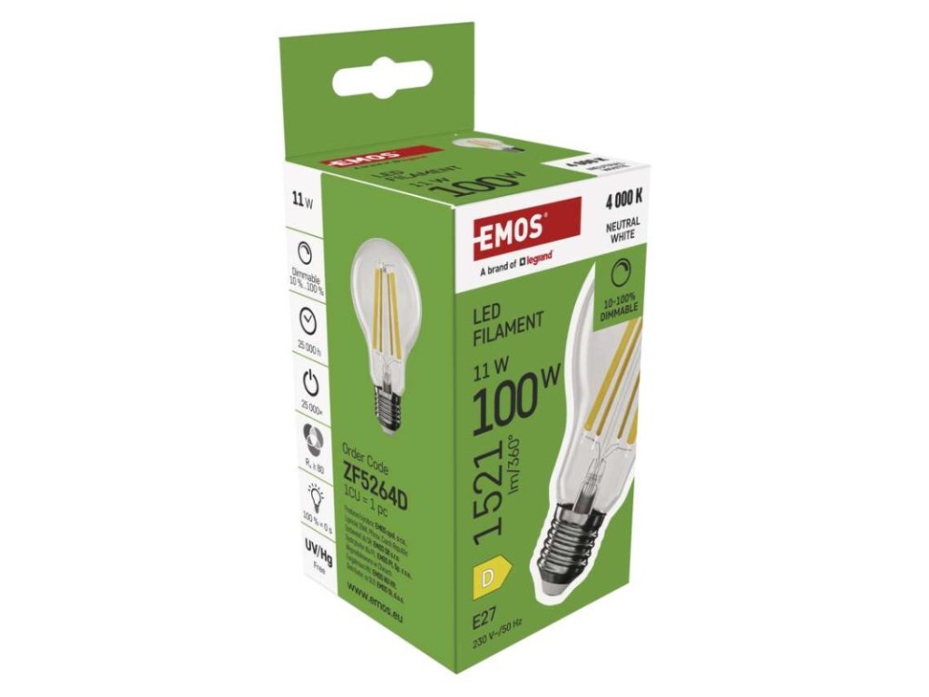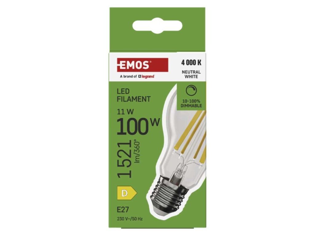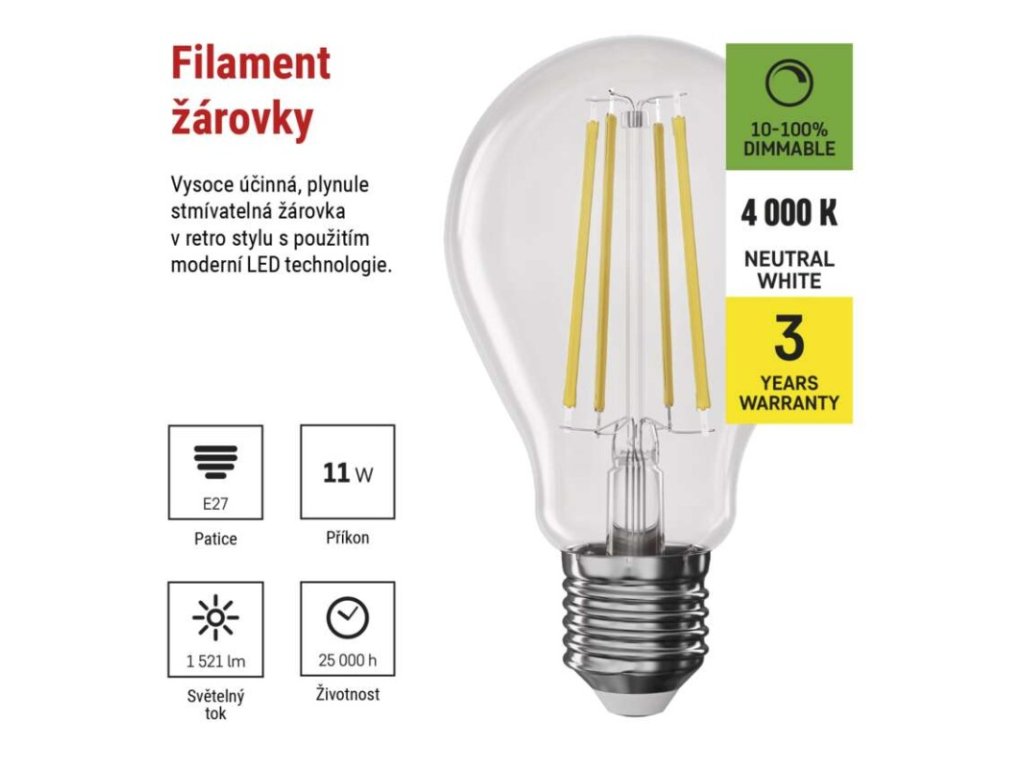 barva světla: neutrální bílá|energetická třída: D|index podání barev (CRI): 80|kompatibilita: –|náhrada za žárovku: 100 W|napětí: 230 V~/50 Hz|notifikace do mobilní aplikace: –|ovládání hlasovými asistenty: –|patice (uchycení žárovky): E27|počet čipů: neuvádí se|počet spínacích cyklů: 25 000|podporované OS: –|přenosová frekvence: –|příkon: 11 W|prodejní obal: 1 ks, krabička|protokol: –|řada: FILAMENT|rozměr: 60 × 60 × 108 mm|stmívatelná: ano|světelná účinnost: 138 lm/W|světelný tok: 1 521 lm|technologie: LED|teplota chromatičnosti: 4 000 K|tvar: A60|typ čipů: COB|účiník: 0,95|úhel vyzařování: 320°|záruční doba: 3 roky|životnost: 25 000 hodin