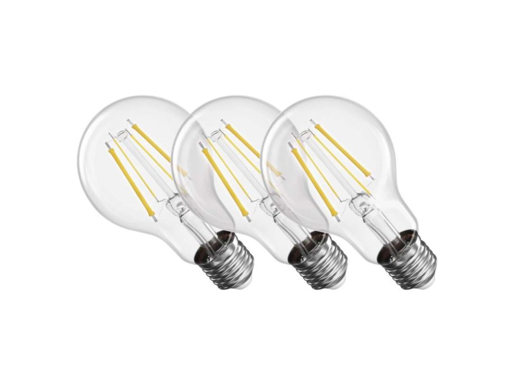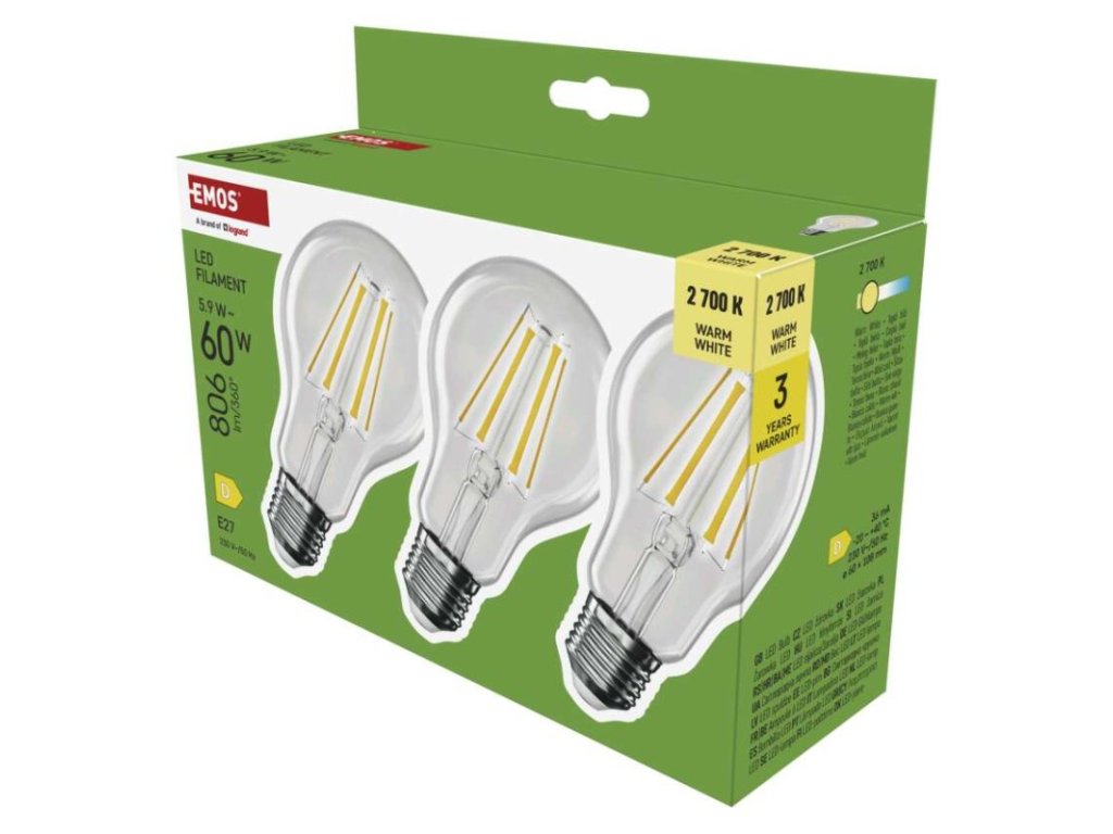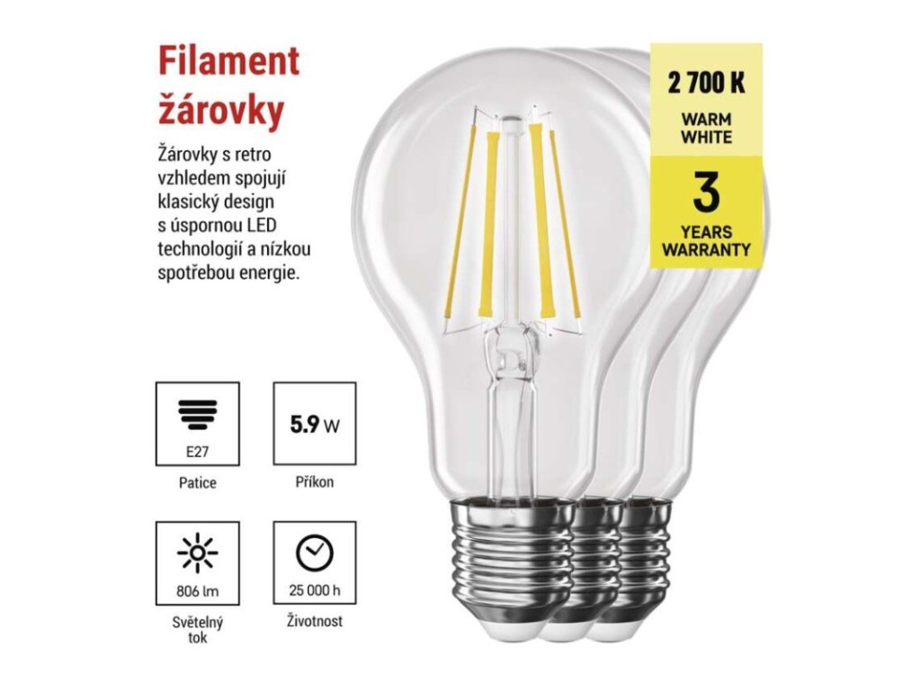 barva světla: teplá bílá|energetická třída: D|index podání barev (CRI): 80|kompatibilita: neuvádí se|náhrada za žárovku: 60 W|napětí: 230 V~/50 Hz|notifikace do mobilní aplikace: neuvádí se|ovládání hlasovými asistenty: neuvádí se|patice (uchycení žárovky): E27|počet čipů: 4|počet spínacích cyklů: 25 000|podporované OS: neuvádí se|přenosová frekvence: neuvádí se|příkon: 5,9 W|prodejní obal: 3 ks, krabička|protokol: neuvádí se|řada: FILAMENT|rozměr: 60 × 60 × 108 mm|stmívatelná: ne|světelná účinnost: 137 lm/W|světelný tok: 806 lm|technologie: LED|teplota chromatičnosti: 2 700 K|tvar: A60|typ čipů: COB|účiník: 0,50|úhel vyzařování: 360°|záruční doba: 3 roky|životnost: 25 000 hodin