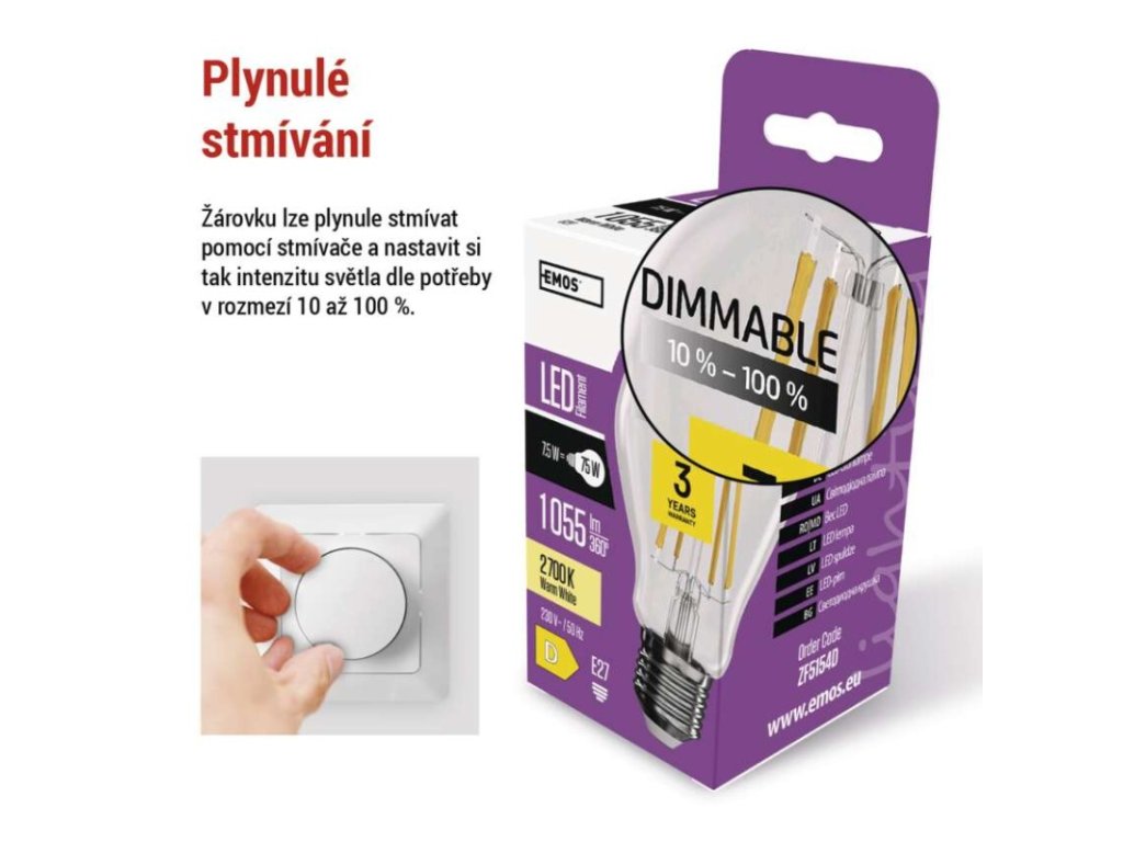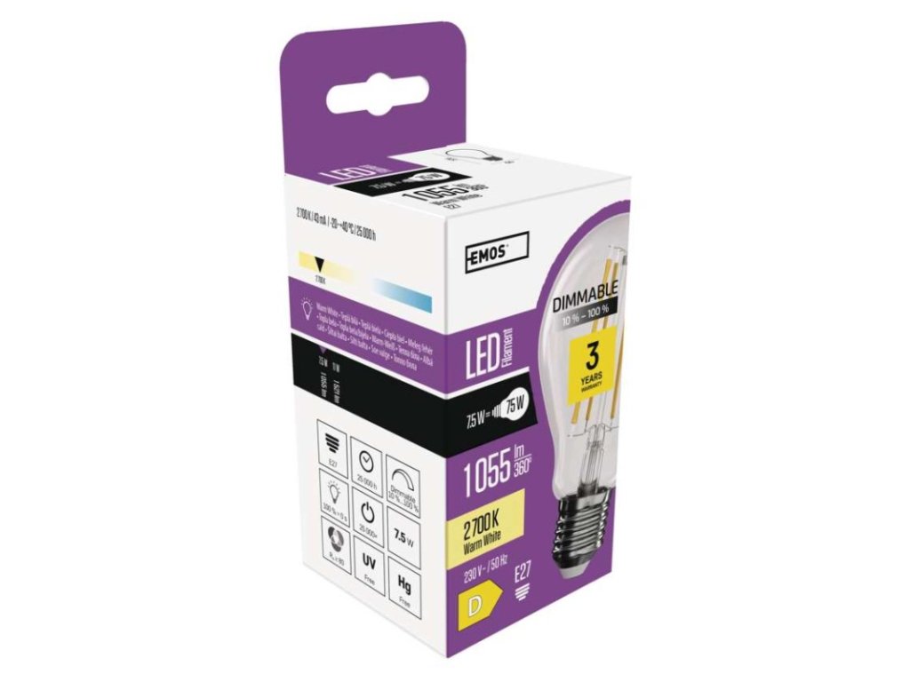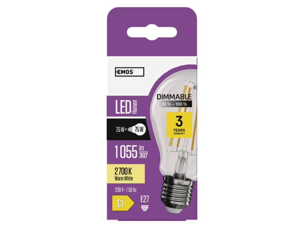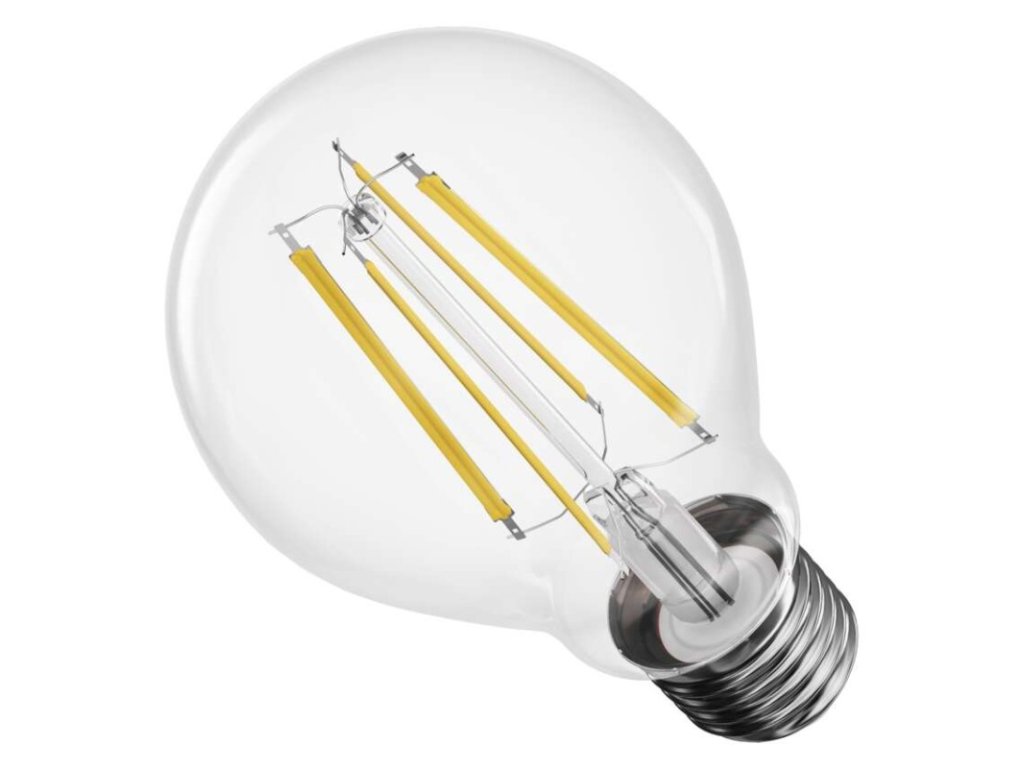 barva světla: teplá bílá|energetická třída: D|index podání barev (CRI): 80|kompatibilita: neuvádí se|náhrada za žárovku: 75 W|napětí: 230 V~/50 Hz|notifikace do mobilní aplikace: neuvádí se|ovládání hlasovými asistenty: neuvádí se|patice (uchycení žárovky): E27|počet čipů: neuvádí se|počet spínacích cyklů: 25 000|podporované OS: neuvádí se|přenosová frekvence: neuvádí se|příkon: 7,5 W|prodejní obal: 1 ks, krabička|protokol: neuvádí se|řada: FILAMENT|rozměr: 60 × 60 × 106 mm|stmívatelná: ano|světelná účinnost: 141 lm/W|světelný tok: 1 055 lm|technologie: LED|teplota chromatičnosti: 2 700 K|tvar: A60|typ čipů: COB|účiník: 0,73|úhel vyzařování: 320°|záruční doba: 3 roky|životnost: 25 000 hodin