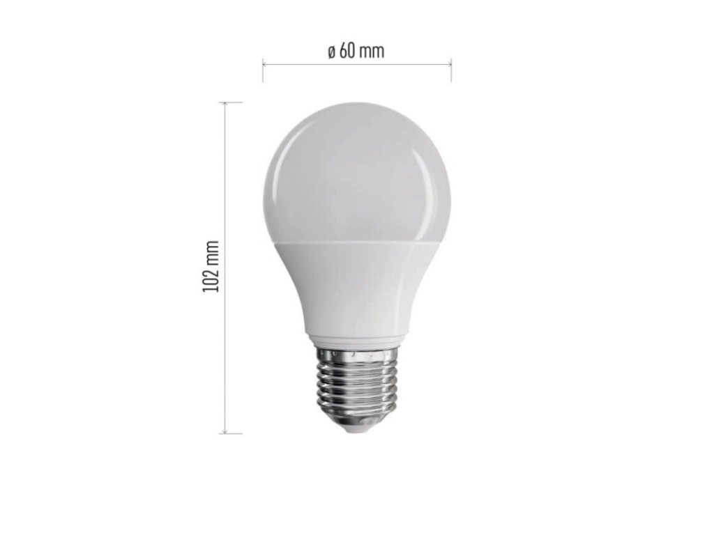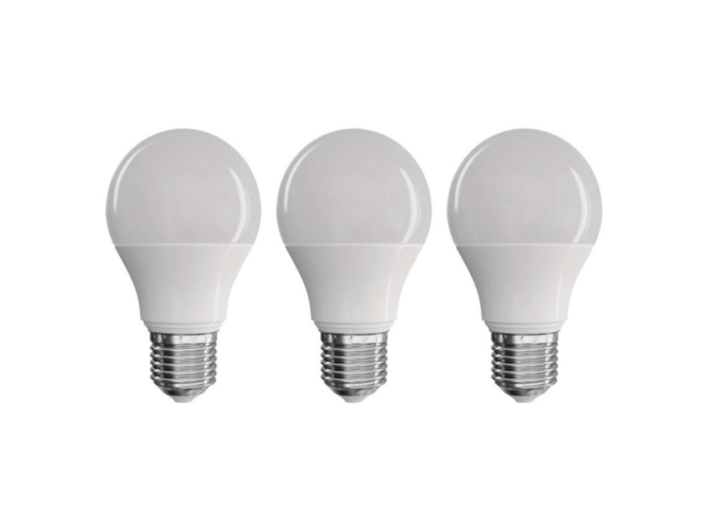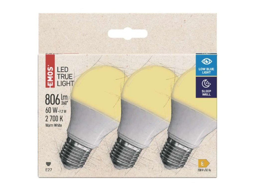 barva světla: teplá bílá|energetická třída: E|index podání barev (CRI): 94|kompatibilita: –|náhrada za žárovku: 60 W|napětí: 230 V~/50 Hz|notifikace do mobilní aplikace: –|ovládání hlasovými asistenty: –|patice (uchycení žárovky): E27|počet čipů: 20|počet spínacích cyklů: 25 000|podporované OS: –|přenosová frekvence: –|příkon: 7,2 W|prodejní obal: 3 ks, krabička|protokol: –|řada: TRUE LIGHT|rozměr: 102 × 60 × 60 mm|stmívatelná: ne|světelná účinnost: 112 lm/W|světelný tok: 806 lm|technologie: LED|teplota chromatičnosti: 2 700 K|tvar: A60|typ čipů: SMD|účiník: 0,57|úhel vyzařování: 180°|záruční doba: 3 roky|životnost: 30 000 hodin