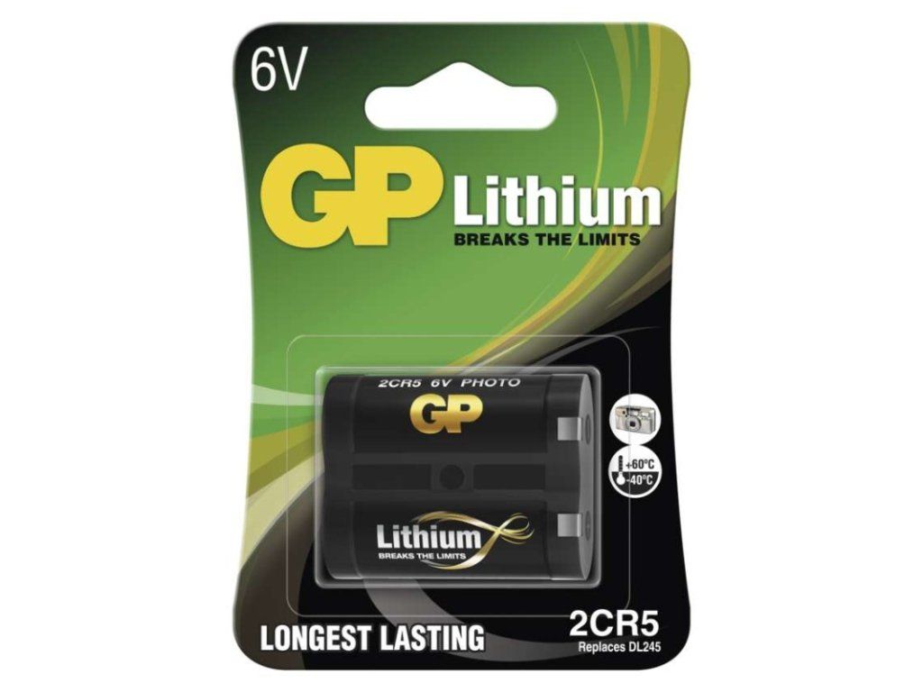 chemické složení: lithiové|hmotnost: 40 g|kapacita: 1 400 mAh|kategorie/řada: Lithium|max. skladovatelnost: 10 let|možnost nabíjení: ne|napětí: 6 V|počet nabíjecích cyklů: nenabíjecí|prodejní obal: 1 ks, blistr|provozní teplota: -40 °C až +60 °C|rozměr: 34 × 17 × 45 mm|typ: 2CR5 (EL2CR5BP, DL245)|velikost baterie: neuvádí se|značka: GP