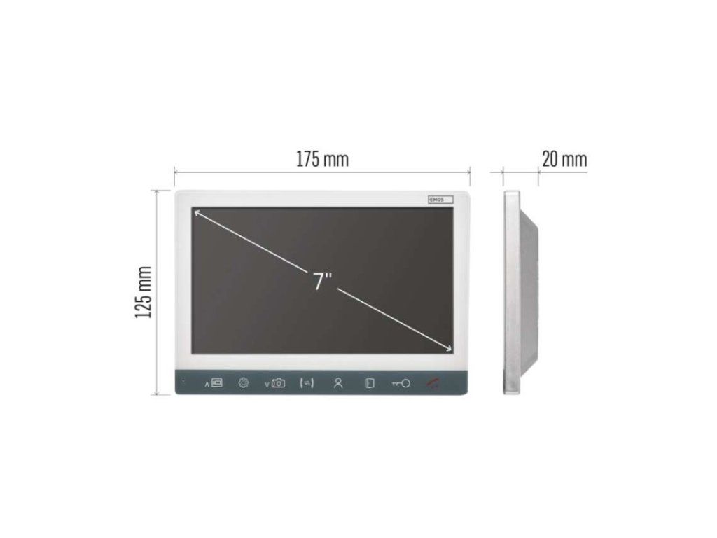 barevný displej: ano|barva: stříbrná|doporučená kabeláž: FTP nebo SYKFY 5 × 2 × 0,5|doporučená kamerová jednotka: H3016, H3017, H3018|intercom: ano|montáž: na stěnu|možnost připojení přídavných kamer: ano|napájení monitoru: 12 V DC (součástí balení)|ovládání pojezdu brány: ano|ovládání zámku: ano|počet melodií: 10 + vlastní|počet propojovacích vodičů (monitor/zámek/brána): 4+0+2|prodejní obal: 1 ks, krabice|regulace hlasitosti: ano|rozměr monitoru: 175 × 125× 20 mm|velikost displeje: 7"|záruční doba: 2 roky